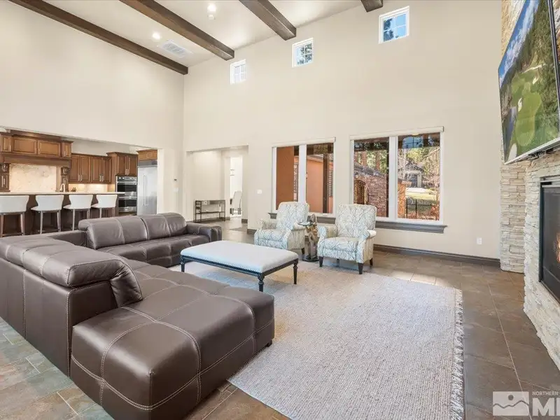 - Floor-to-ceiling stone fireplace
