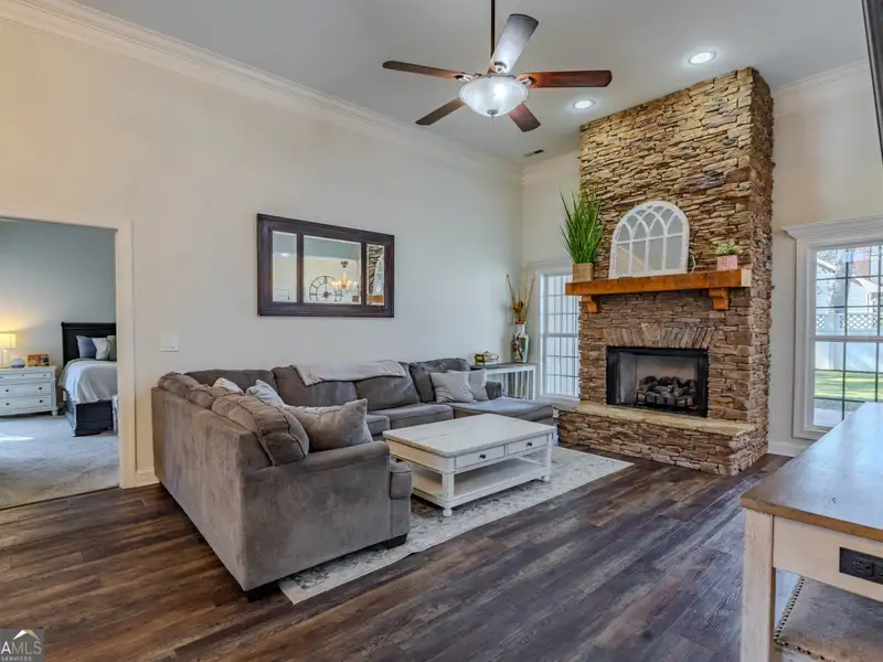 - Open floor plan with rock fireplace