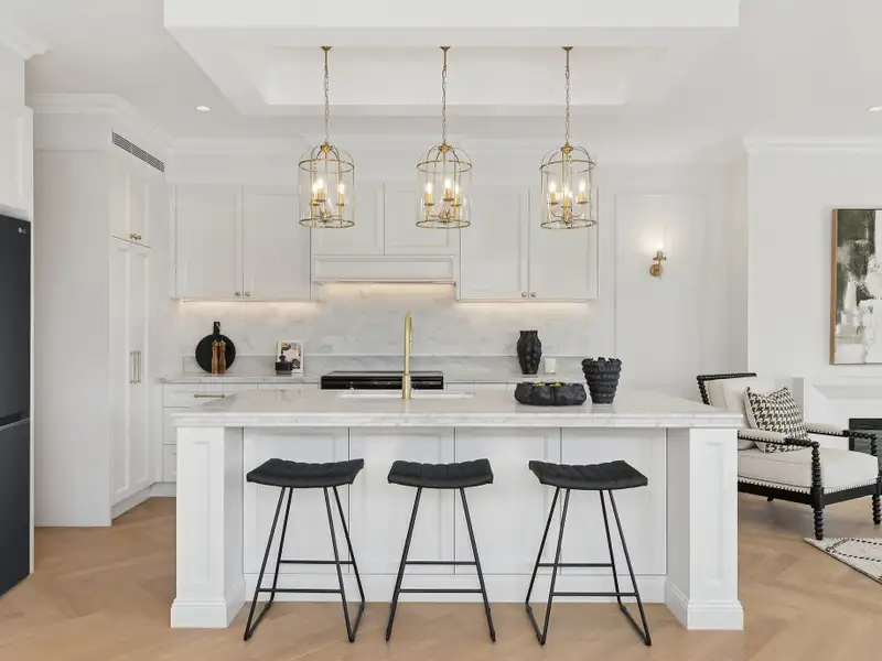 - Kitchen with marble island and Smeg stove