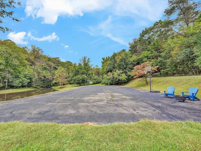 - Large paved parking, former tennis court