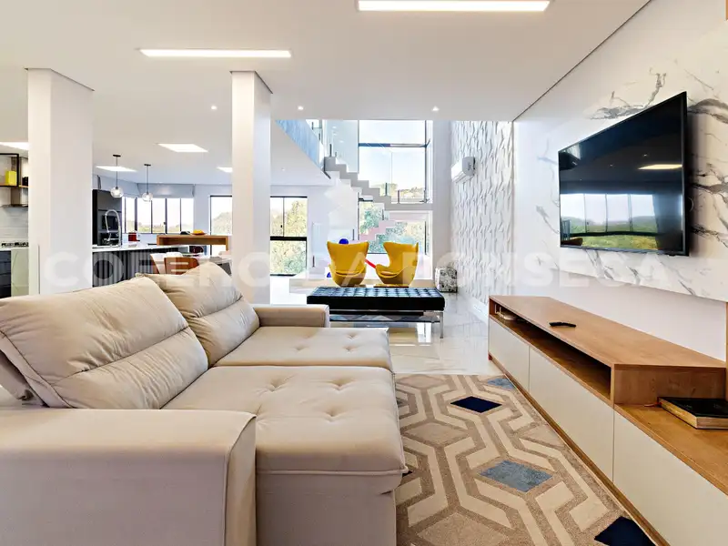 Tenha o privilégio de viver em uma Casa de Alto Padrão, localizada em um Condomínio com excelente custo benefício e infraestrutura completa. Esse imóvel oferece uma vista permanente para a mata preservada, com um lote em declive considerado o melhor do condomínio. A casa é repleta de iluminação natural, graças às amplas janelas que proporcionam um ambiente arejado e acolhedor. Com detalhes de qualidade, como porcelanatos de 1ª linha e pé direito duplo com mais de 6m, a residência exibe elegância e sofisticação. Além disso, conta com todos os ambientes climatizados com ar condicionado e móveis planejados de alta qualidade.