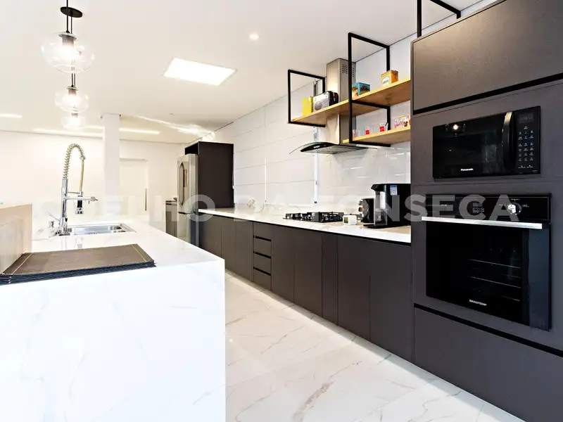 Cozinha com ilha em porcelanato e equipada com muitos armários