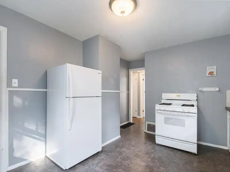 - Kitchen with white cabinetry and ample counters