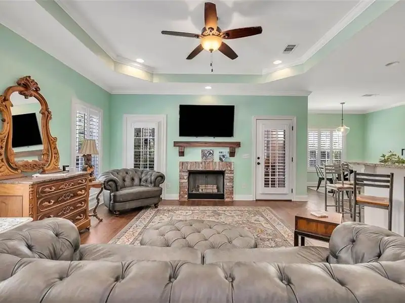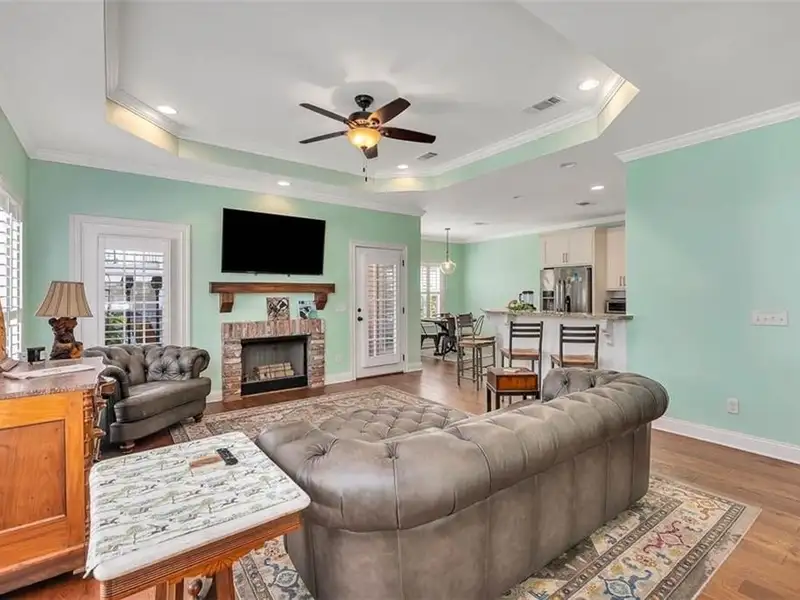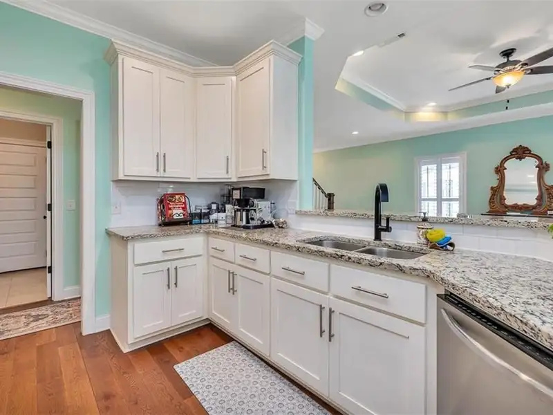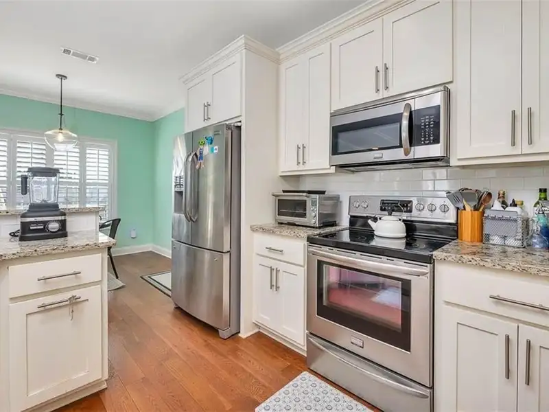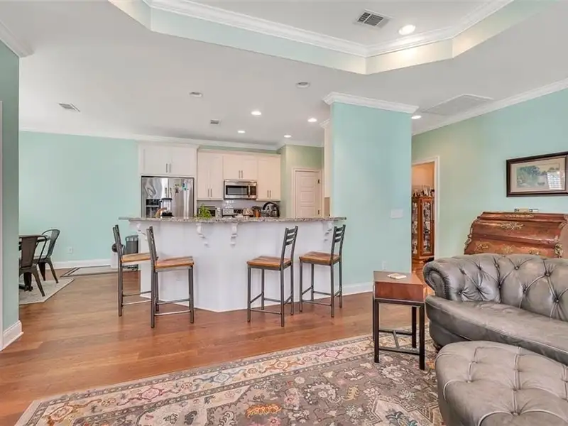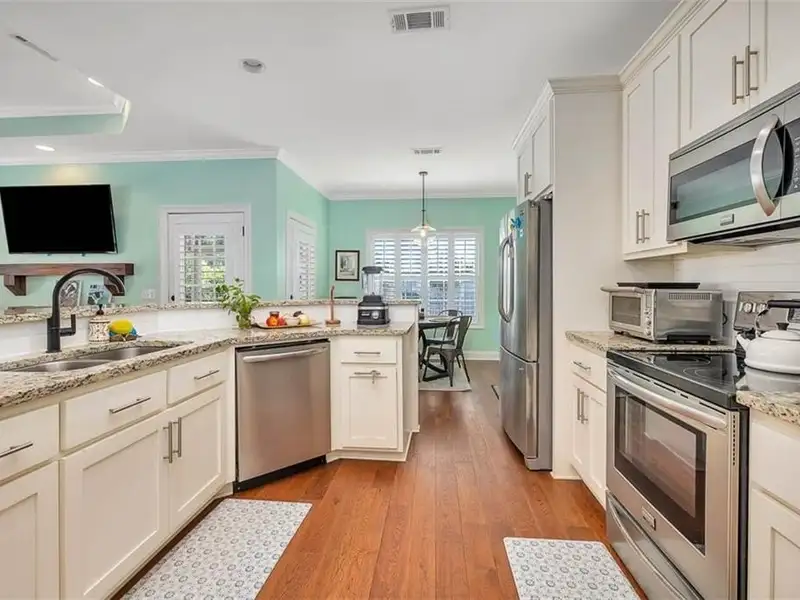 - Open kitchen with granite counters and stainless appliances