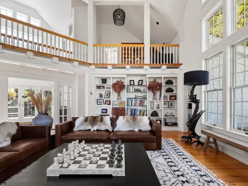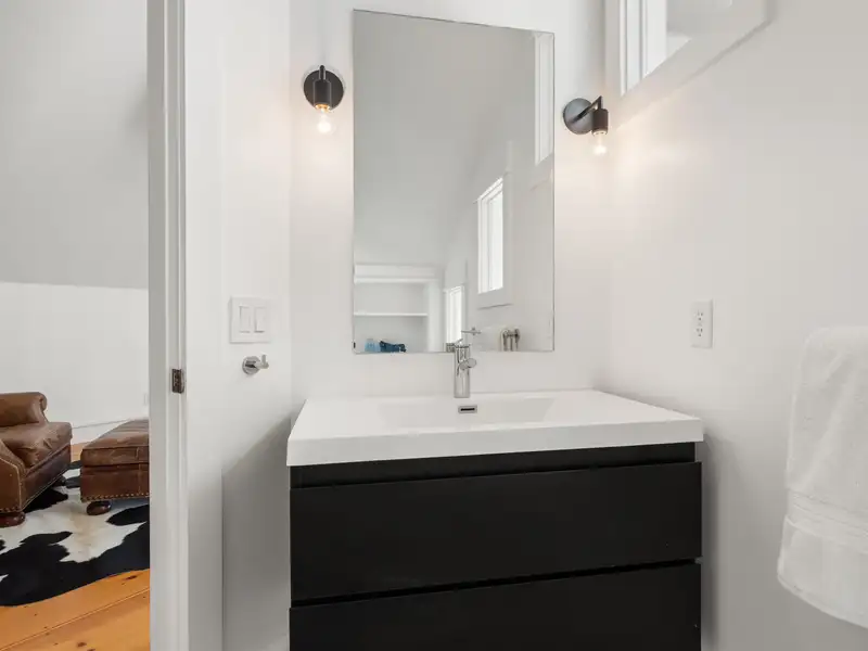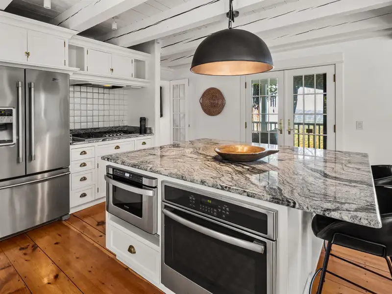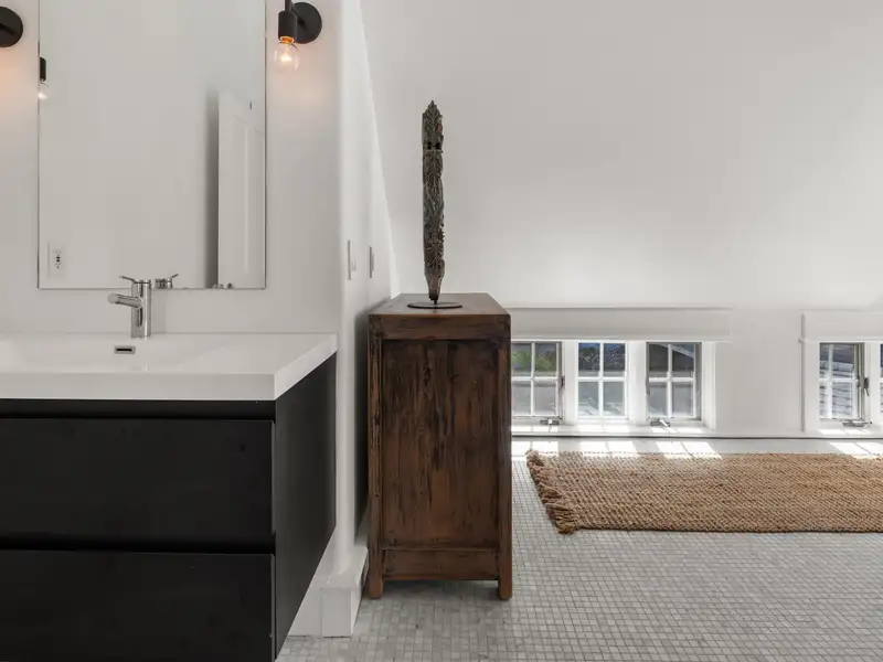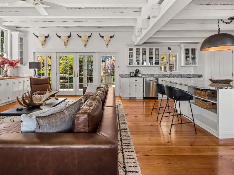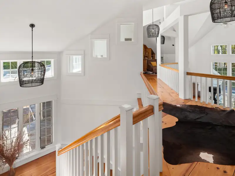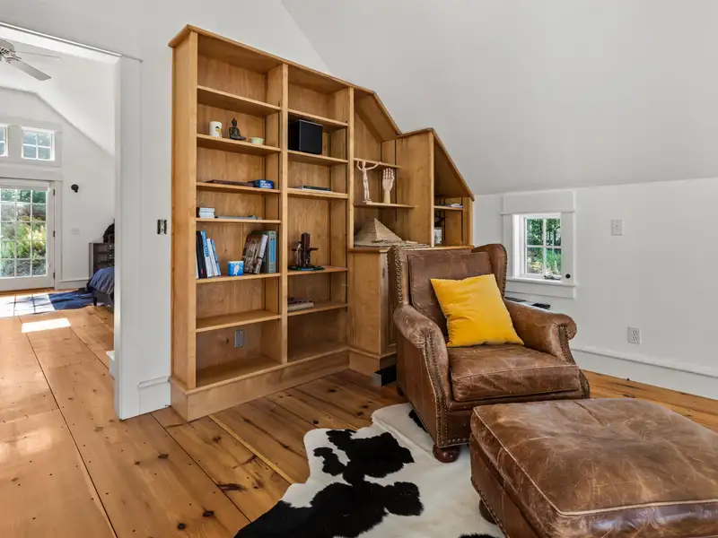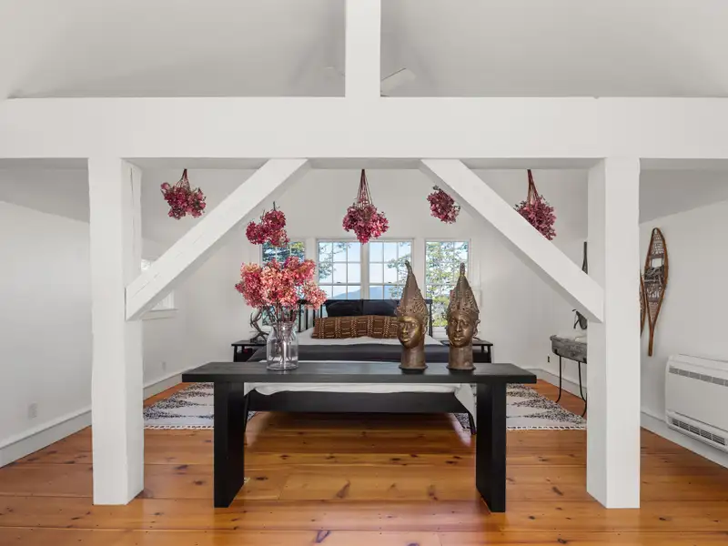 - Wide-plank pine floors with alpine décor