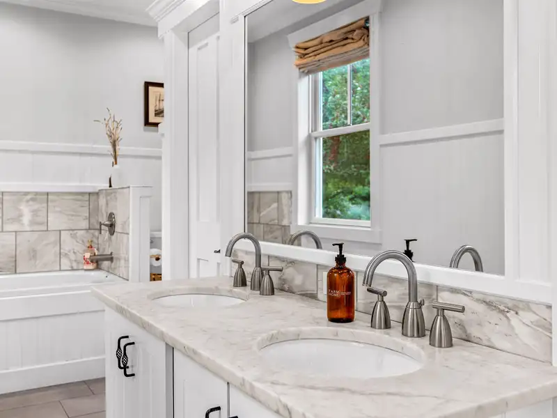 - First-floor primary suite with dual walk-in closets