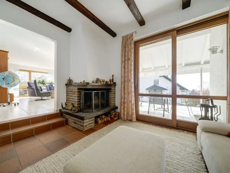 The heart of the house is the light-flooded living room with fireplace, which creates a pleasant atmosphere on chilly days. The spacious conservatory adjoins and functions as a further room, offering an unobstructed view of the surrounding countryside through the large windows. From here, you have direct access to the adjoining terrace, which, like the balcony on the upper floor, offers plenty of opportunities to spend relaxing hours outdoors.