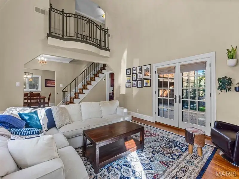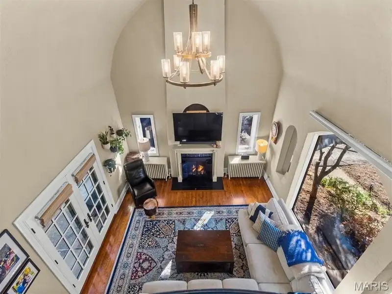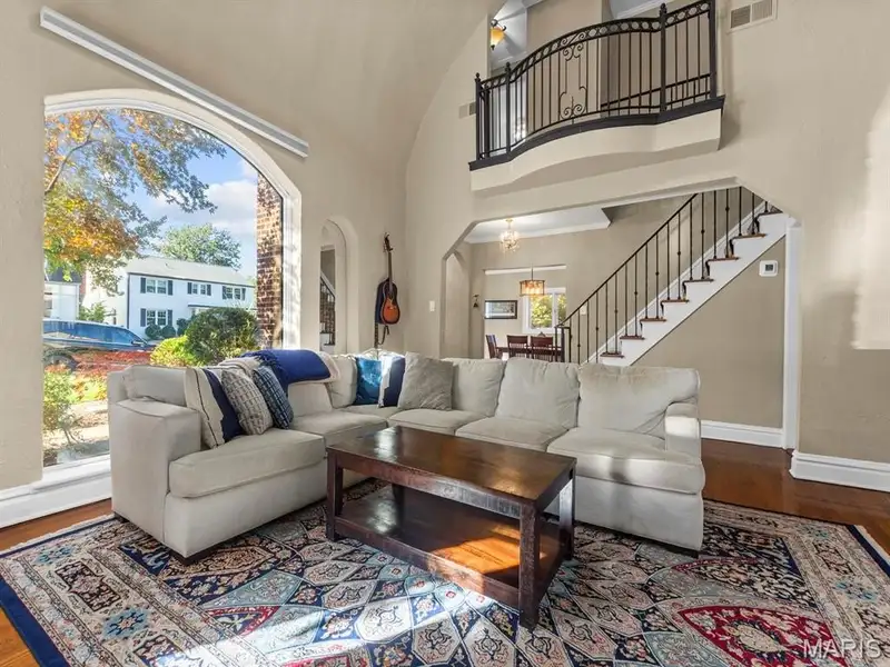 - Living room with vaulted ceiling and balcony