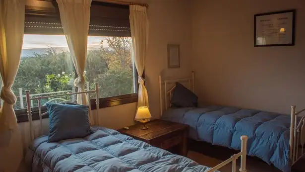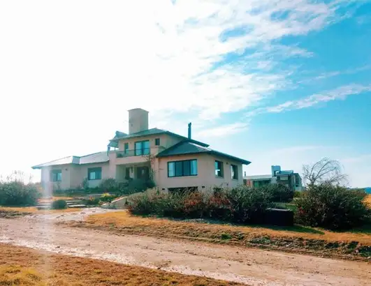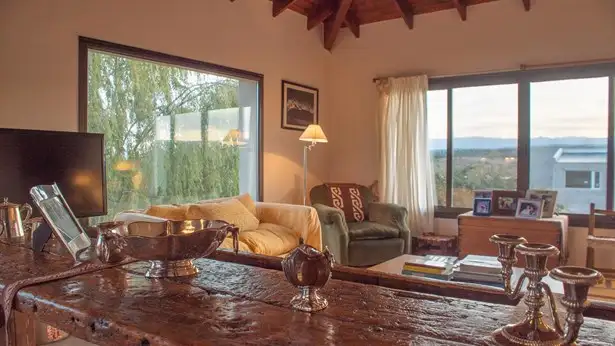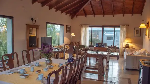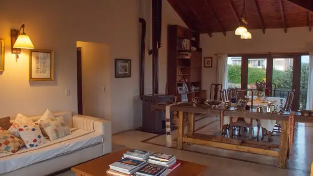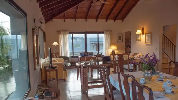 En la planta baja posee un amplio ambiente de living - comedor con salida a la galería con vista a ambas sierras y al sur con grandes ventanales, una estufa Tromen en el centro con tubería para calefaccionar los ambientes.