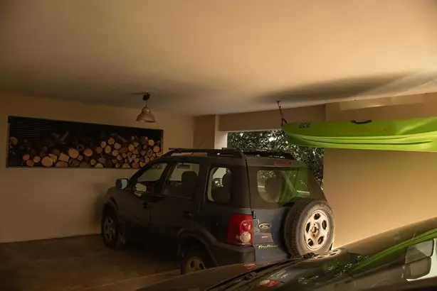 En el subsuelo se encuentra la cochera con lugar para cuatro vehículos con espacio para acopio de leña y para rodados menores y bicicletas. Con un amplio dormitorio de huéspedes con baño completo y un cuarto para el guardado de objetos.