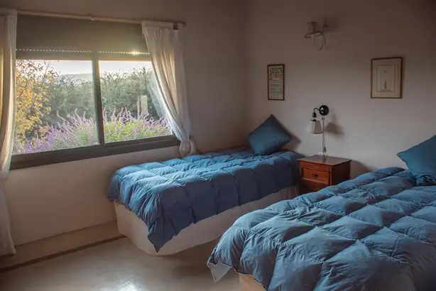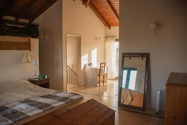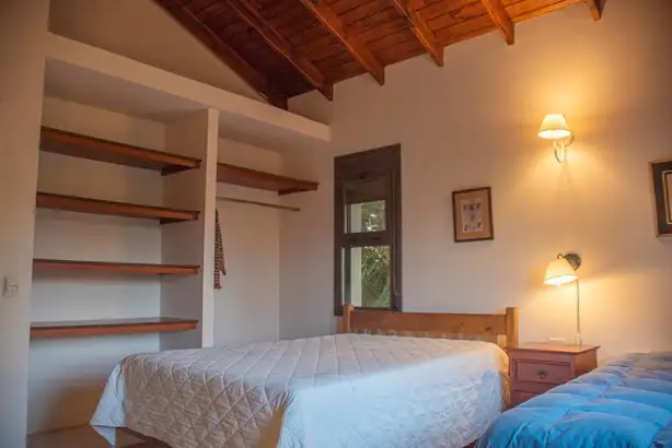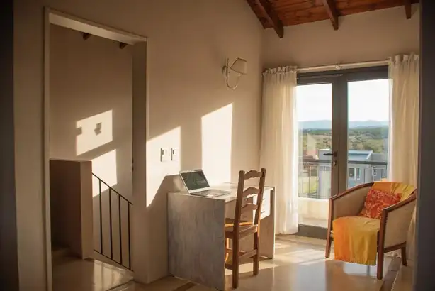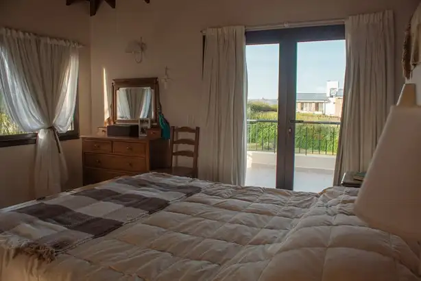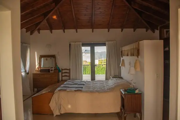 En el nivel superior se encuentra la habitación principal con baño en suite con bañadera, dos (2) balcones, al oeste con vistas a las sierras grandes y al este con vista al jardín y sierras chicas.