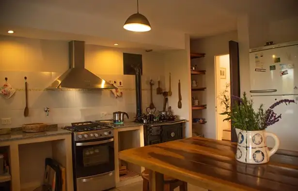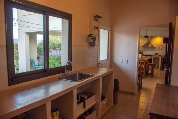 Una gran cocina comedor luminosa, con vista y salida a la galería y al jardín, con mucho espacio para almacenamiento que incluye una hermosa cocina económica. Separado hay un lavadero luminoso, con espacio de guardado en dónde se encuentra la caldera de agua domiciliaria.