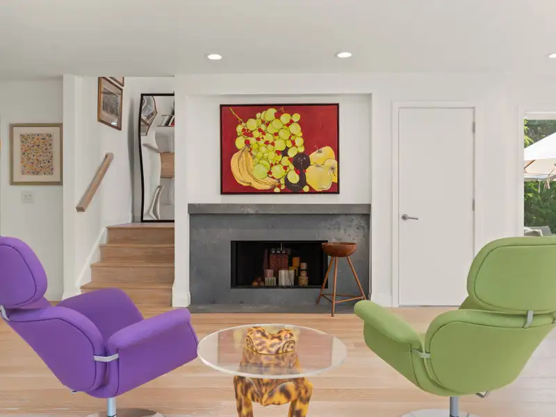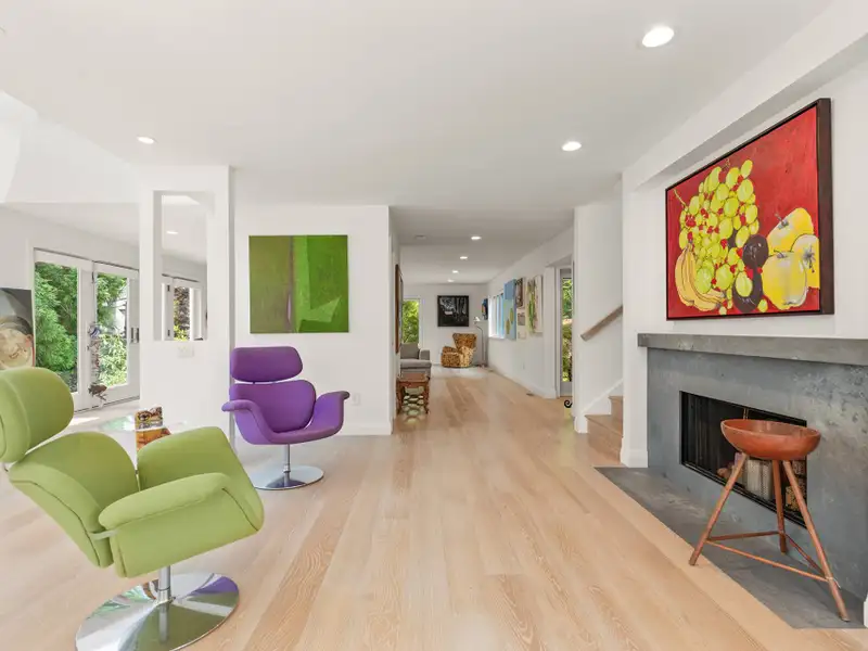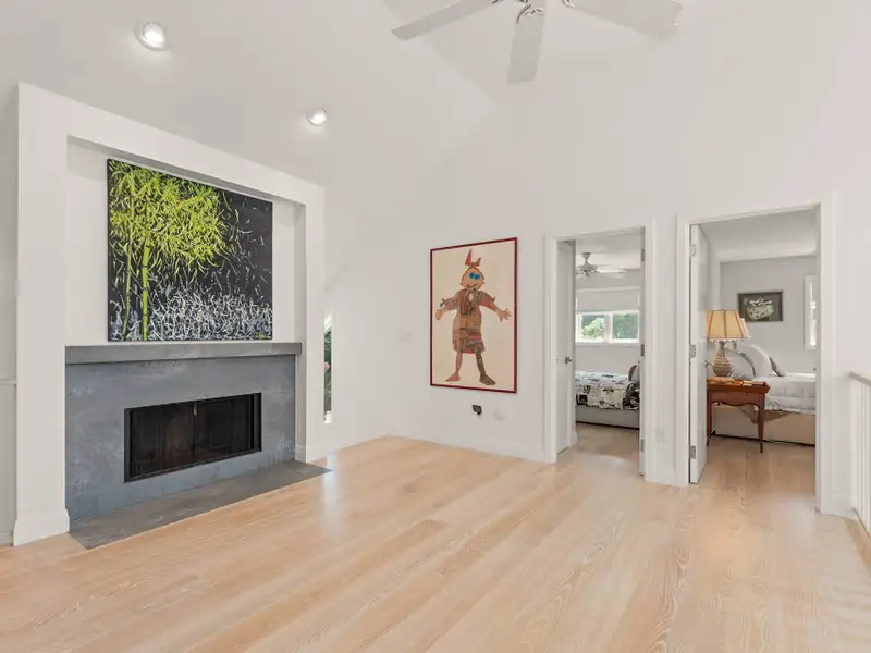 - Large open living room with fireplace