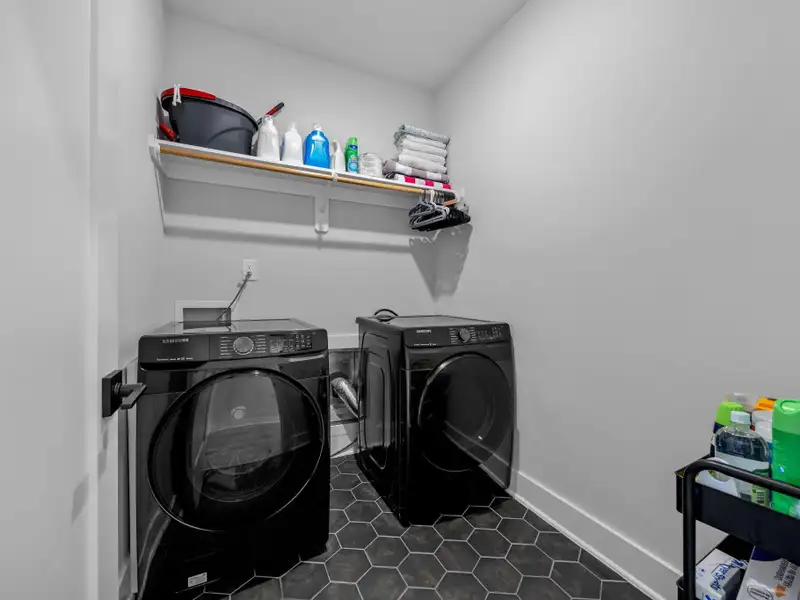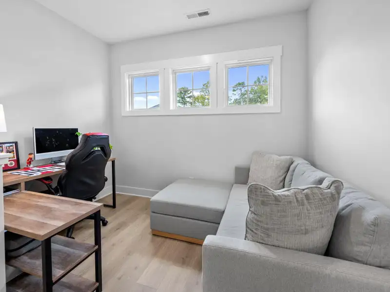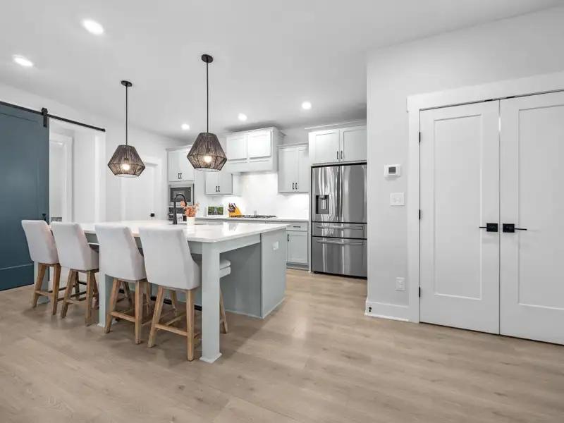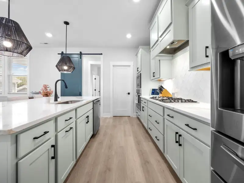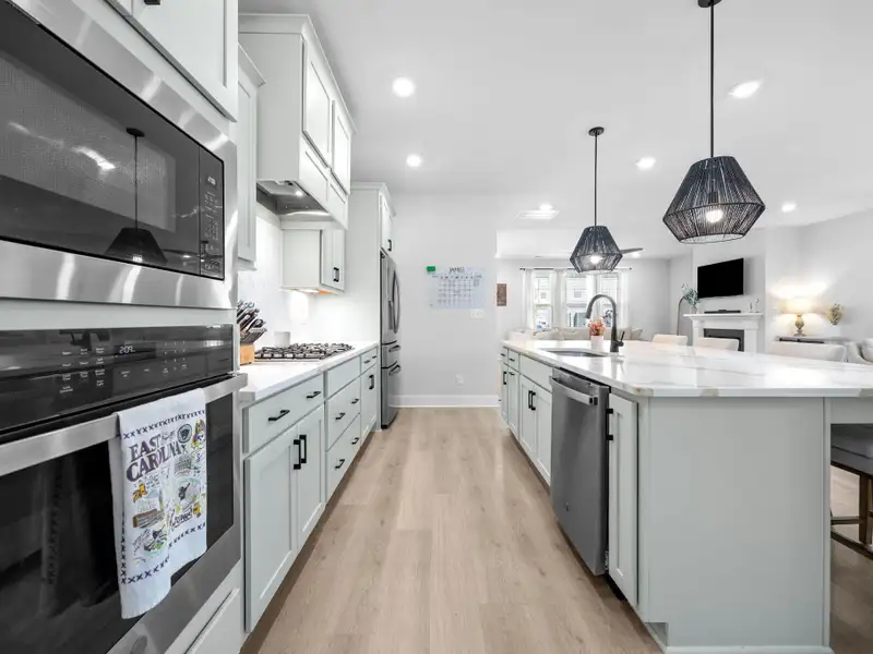 - Kitchen with quartz countertops and gas range