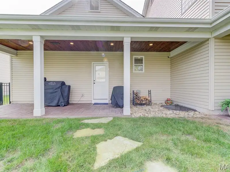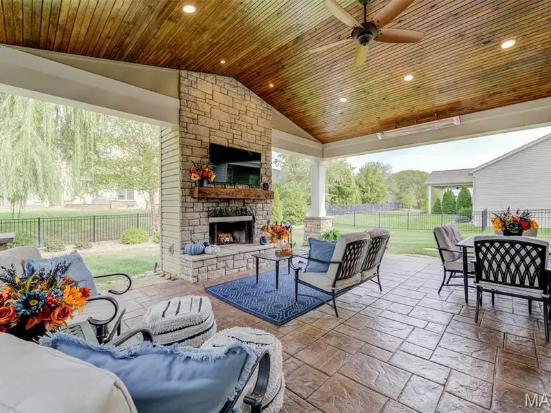 - Large covered patio with stone fireplace