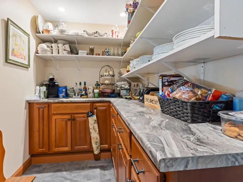 - Kitchen with granite countertops and pantry