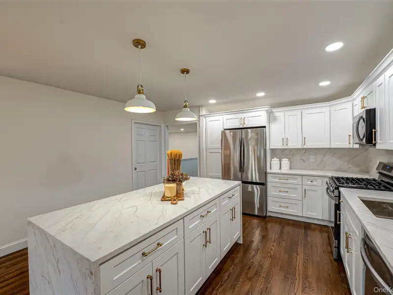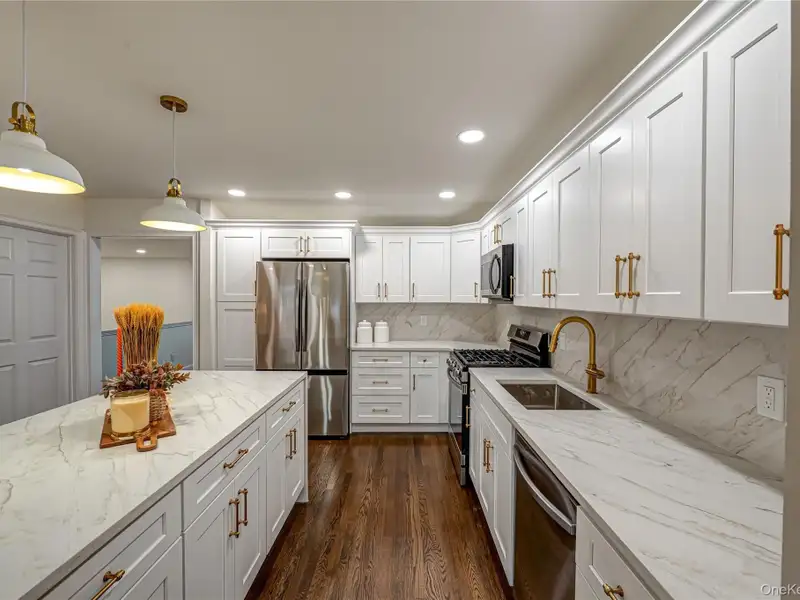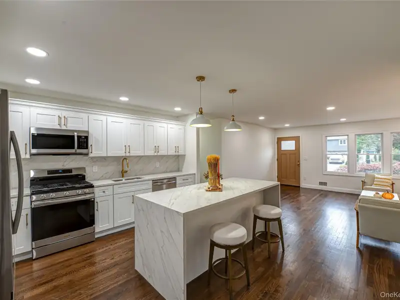 - Chef’s eat-in kitchen with quartz counters