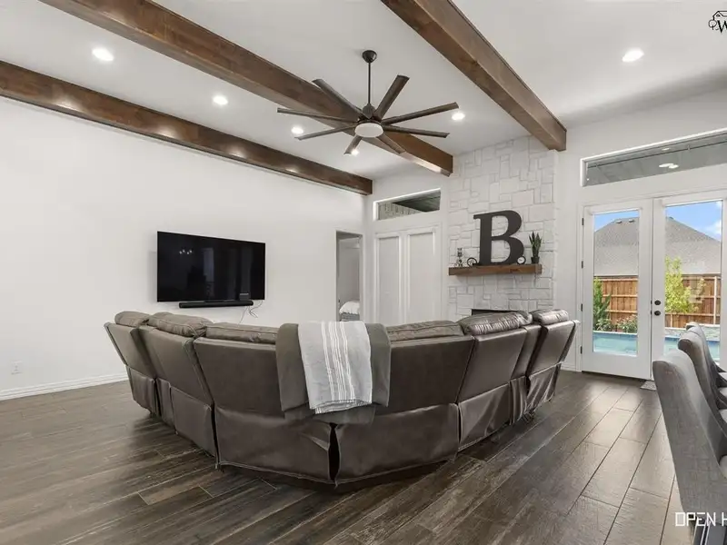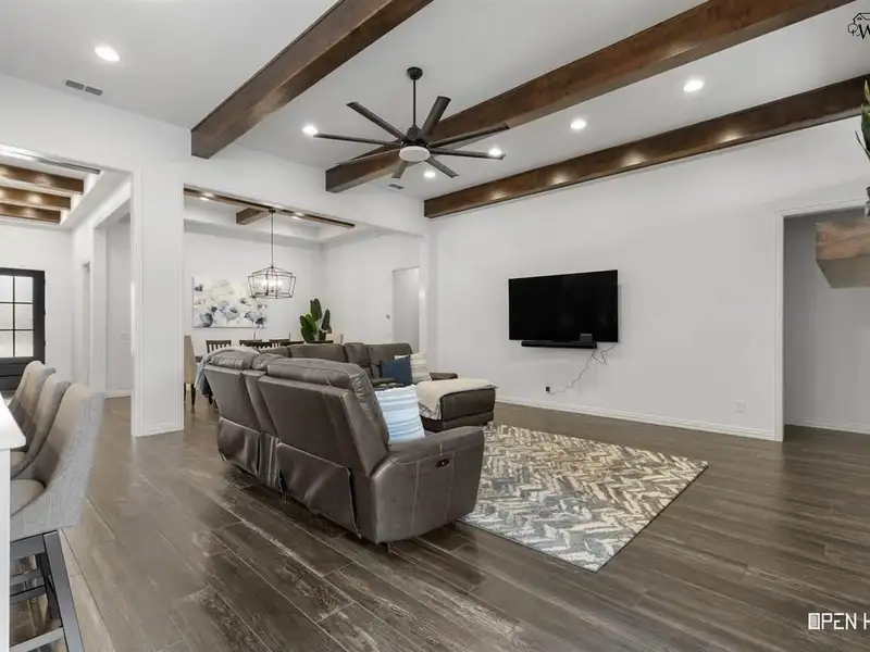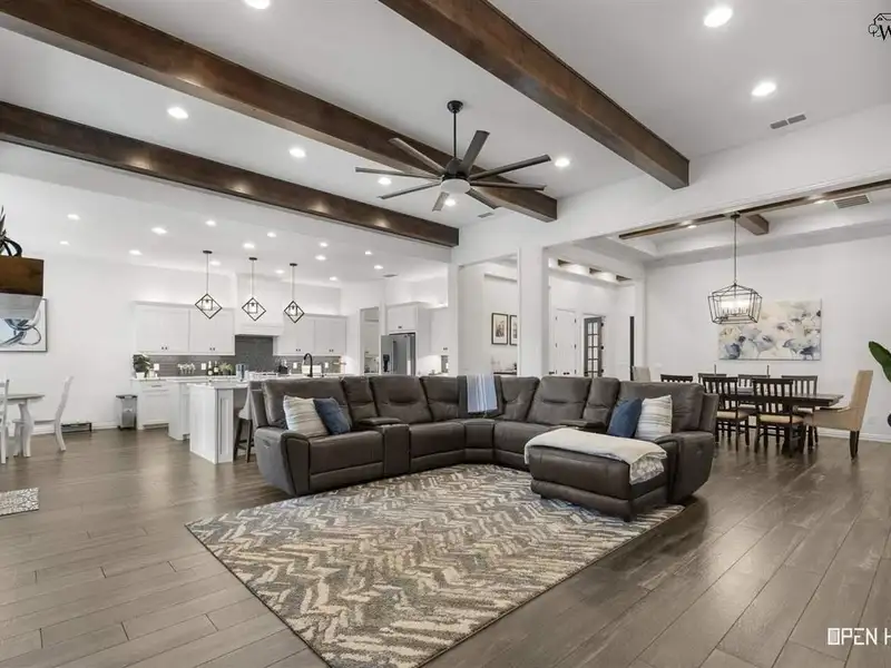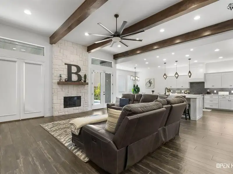 - Open floor plan with stone fireplace