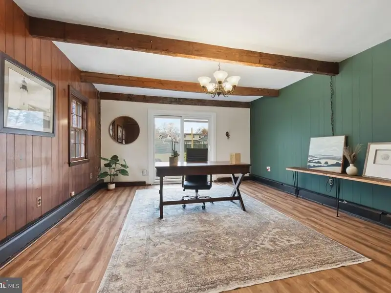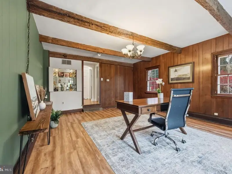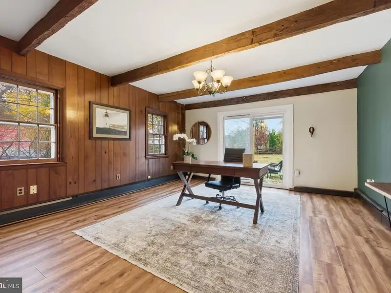 - Exposed wood beams in sunken family room