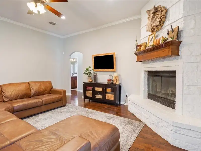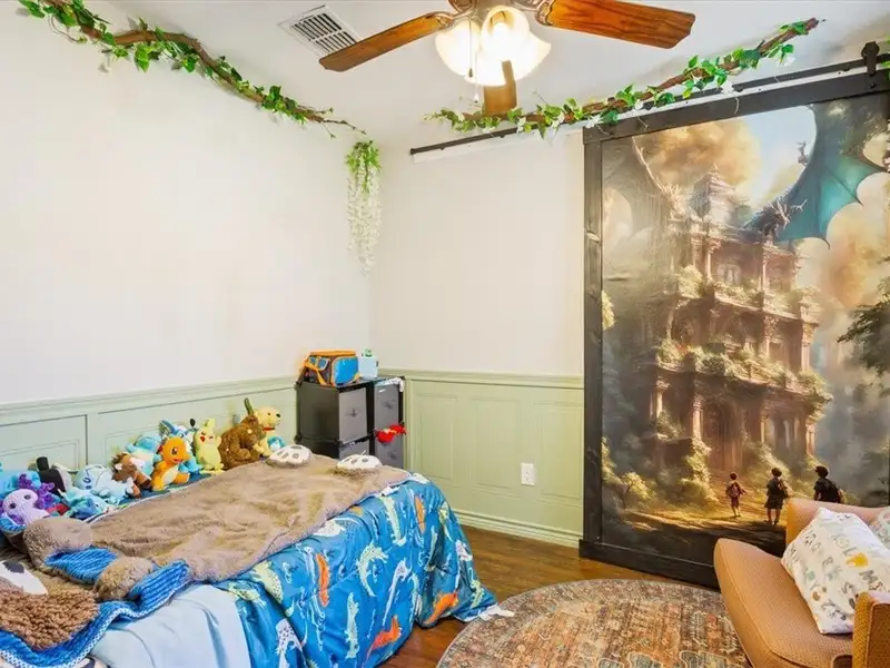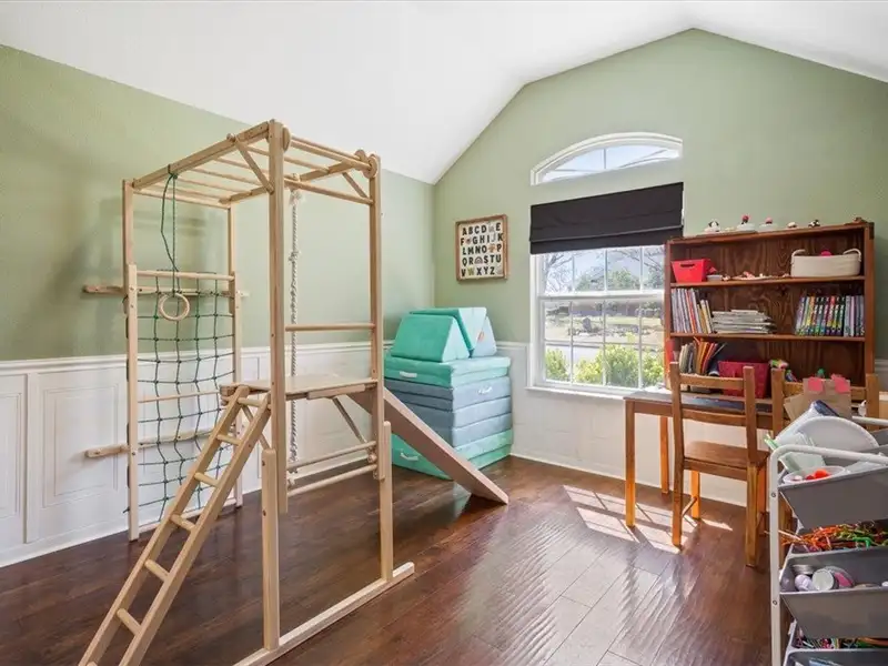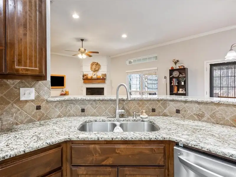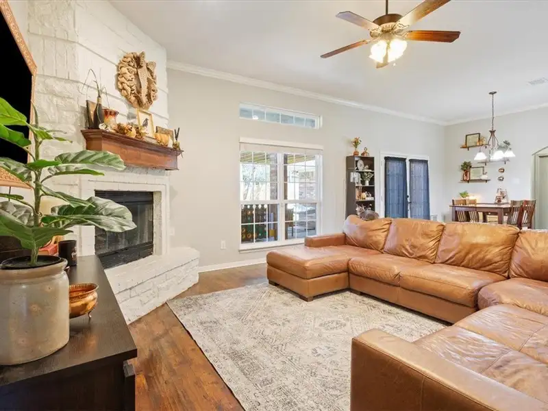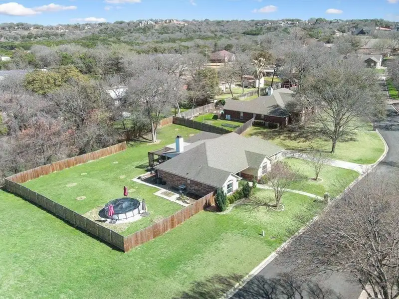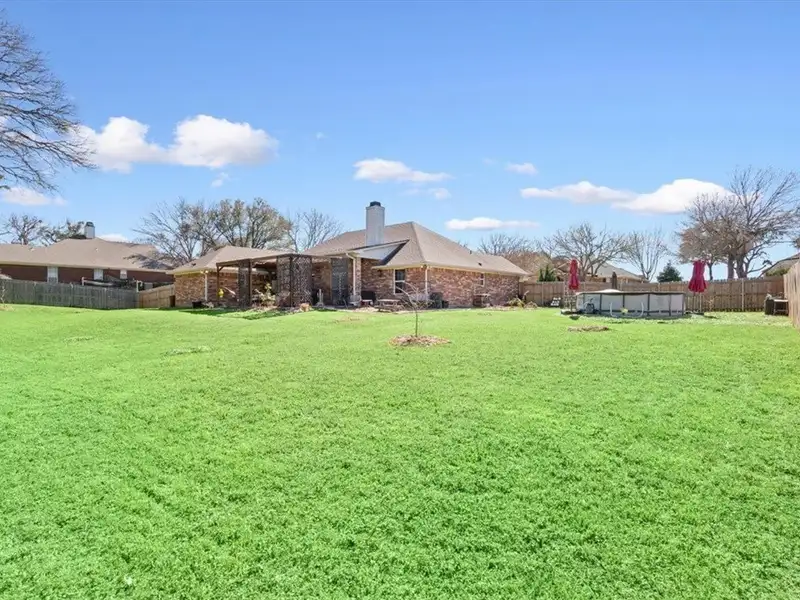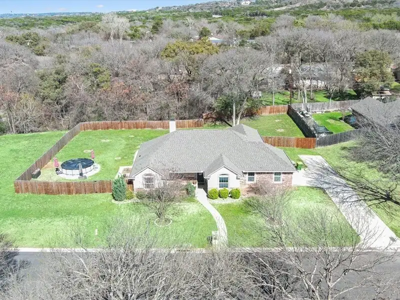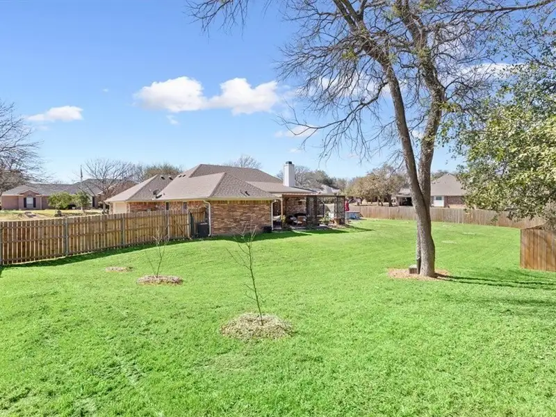 Nestled in the desirable Deer Ridge subdivision of Woodway, TX, near the serene waters of Lake Waco, this stunning modern ranch-style home offers a perfect blend of elegance, comfort, and nature. Situated on a generous 0.50-acre lot, the property boasts impressive brick and stone architecture, soaring ceilings, and rich dark engineered hand-scraped wood flooring that enhances both style and ease of maintenance. The front yard is a picturesque retreat with mature crepe myrtle trees, lush landscaping, and a charming Butterfly Garden featuring vibrant Zinnias, Morning Glories, Mint, and Nasturtium, welcoming you to the home. Inside, the entryway leads to a versatile front room that can serve as a formal dining area, office, or second living space—currently a delightful play area for kids. The heart of the home is the open-concept kitchen, where custom dark wood cabinetry offers ample storage, complemented by sleek stainless steel appliances. A countertop bar provides casual seating, making meal prep a social experience. Flowing seamlessly into the dining and living areas, the space is anchored by an Austin stone wood-burning fireplace with a hearth for additional seating and a wood mantel for display. Expansive windows across the back of the home provide breathtaking views of the vast backyard, which is a true outdoor oasis. An extended concrete patio, featuring both an open pergola and covered seating areas, creates a dream setting for entertaining and relaxation. The isolated primary bedroom is a private retreat, painted in a striking midnight blue with dark brass fixtures, offering a spa-like en-suite bath complete with a luxurious soaking tub. On the opposite side of the home, three additional bedrooms share a well-appointed hall bath. Step outside to discover the “WOW FACTOR” — a sprawling, fully fenced backyard perfect for soccer games, football, or simply soaking in the beauty of nature. An above-ground swimming pool in the side yard conveys with the property, while numerous native Texas saplings, including Red Maple, Bald Cypress, Pine, Cedar Elm, Mexican Plum, Peach, and Mexican Buckeye, have been thoughtfully planted to provide shade and natural beauty in years to come. Gardening enthusiasts will appreciate the raised garden beds along the side of the home, already thriving with Blackberries, Blueberries, Tomatoes, Potatoes, and a variety of herbs. This peaceful and secluded neighborhood, designed as a large horseshoe-shaped street, sees very little traffic, making it ideal for quiet living. With an incredibly low HOA fee of just $150 annually for the care of the beautifully maintained entrance, this Deer Ridge gem offers an unparalleled combination of modern comfort, thoughtful landscaping, and a true connection to nature.