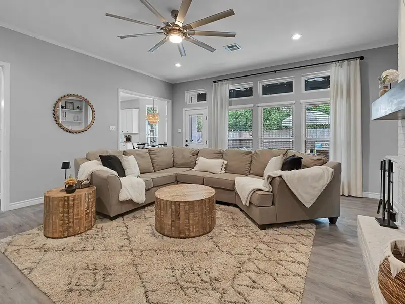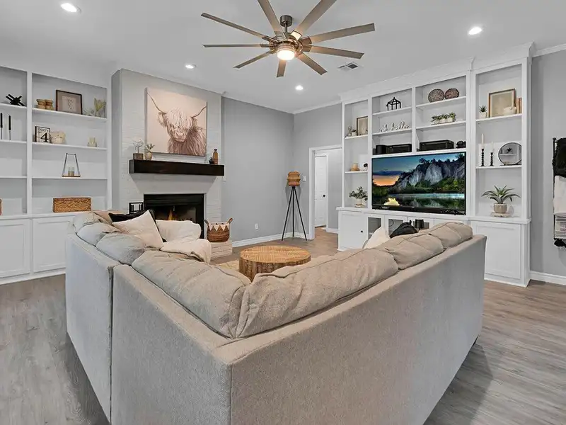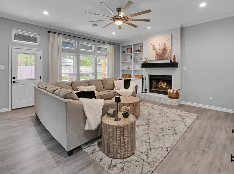 - Built-in wood-burning fireplace in living room