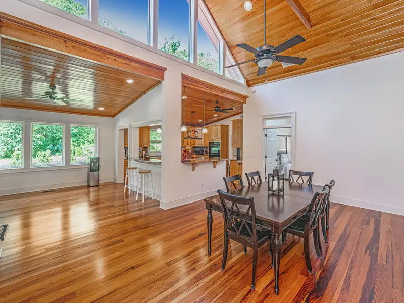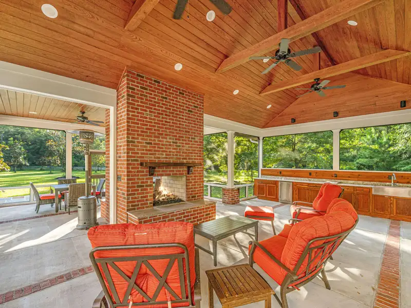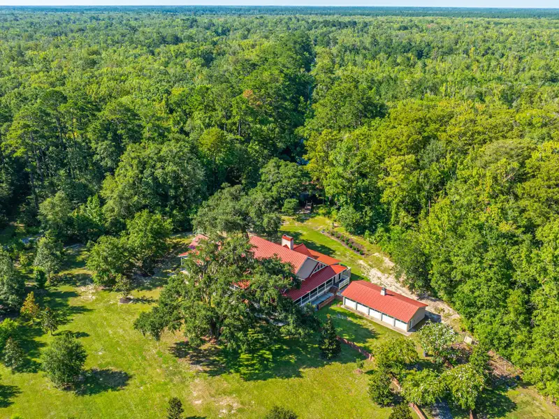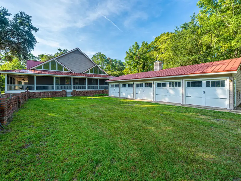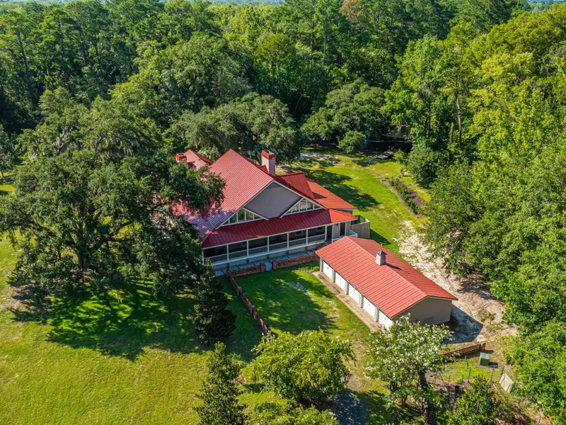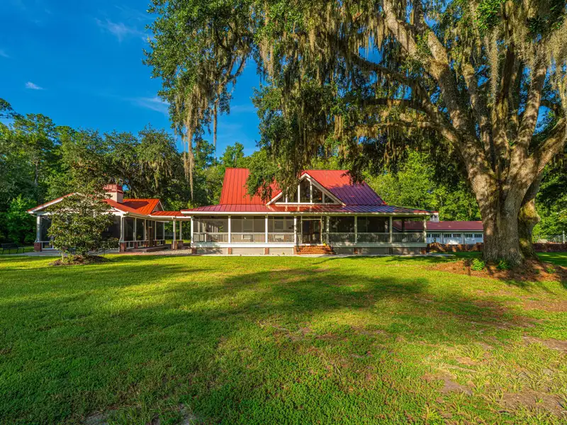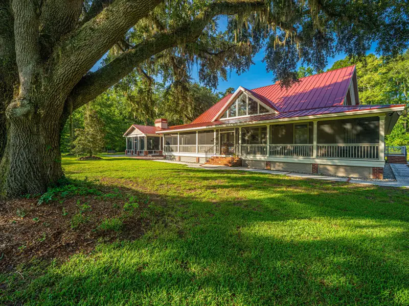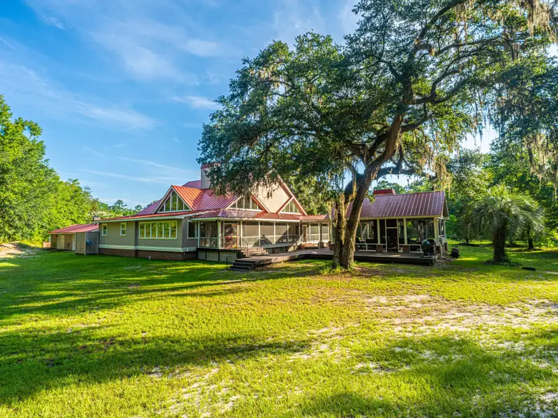 carriage house and irrigation from the nearby well. The house Main was designed as one of the last projects of Doug Corken, a well-known Lowcountry architect. A wide screened porch with burnt poplar screen doors keeps the porch nearly bug free while you sip your mint julep under the cool breeze of the numerous overhead paddle fans. The cypress ceilings on the porch ceiling add to the aesthetics. The exterior of the house has six large trapezoidal windows. One window for each of the vaulted ceilings in the four bedrooms, and two windows at each end of the main living room with its massive fireplace. The Carolina room in the main house faces the canal. The full length of the Carolina room is covered with windows for unobstructed view of wildlife and the canal. It was completed in approximately 2015 at the time the screened cook shed is was built . The screened cook shed is great for entertaining and is approximately 1,000 Sq Ft. under roof. The deck behind the guest house's main bedroom was replaced in 2025, and wooden hand railing on the deck and steps were replaced with durable black metal. A chimney lies just outside of the guest house which would make a great spot for an outdoor fireplace. Approximately 1 hour to Charleston or Savannah, 30 minutes to Beaufort. 45 minutes to Hilton Head.