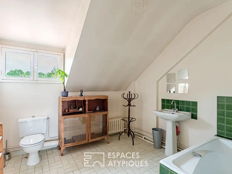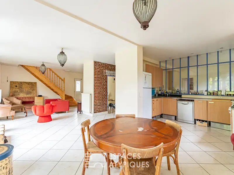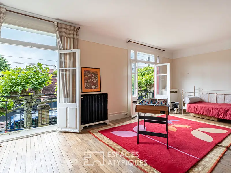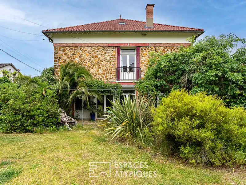 A few steps from the Chatou RER A station, in a sought-after residential area, this 1920 millstone house offers 283 sqm of living space, built on a 590 sqm wooded plot facing south.
