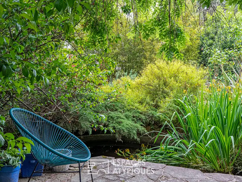 The carefully landscaped garden creates a soothing atmosphere thanks to a beautiful fountain feeding a pond, evoking a Zen ambiance.