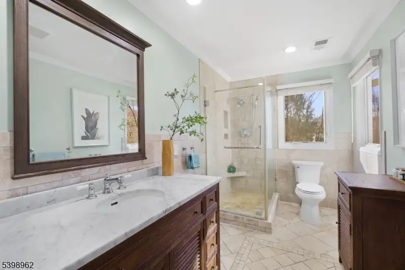 Picture perfect brick front Center Hall Colonial set back beautifully on a spectacular corner lot showcase property in a welcoming and commuter-friendly east Chester Township neighborhood--a truly compelling luxury home boasting over $323,000 in recent upgrades, renovations, and improvements. 9 rooms including 4 airy bedrooms, 3 full baths, powder room, fireplace, and brimming with many desirable features and captivating details including volume ceilings, custom millwork, stylish lighting, many new windows, lustrous refinished hardwood flooring, and a dazzling, completely renovated designer kitchen. This 3,168 sq ft home has a comfortable, spacious floor plan and seamless flow with the added utility and comfort of a sprawling finished lower level with full bath, home office, and guest/in-law suite, plus a 2-car attached garage replete with Tesla charging station, newly paved driveway with ample parking, new three-tier Trex deck, new bluestone walkways, pancake flat rear yard (pool possible), exquisite landscaping, and rear yard with tree-lined borders on three sides ensuring the utmost backyard privacy; new roof, new whole-house natural gas back-up generator; new HVAC systems; new money-saving solar panels. Expertly maintained, thoughtfully updated, and move-in ready- a wonderfully pristine home