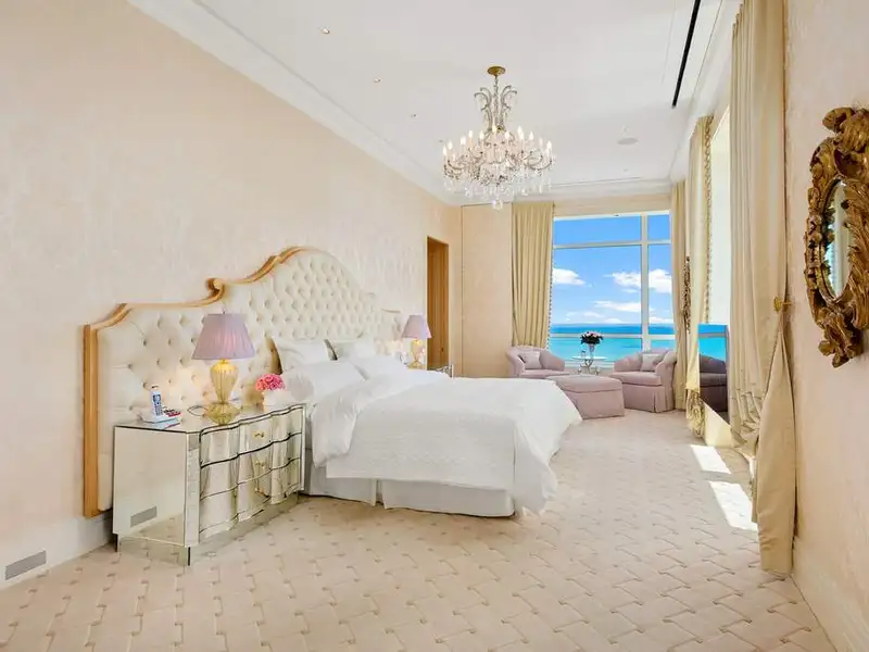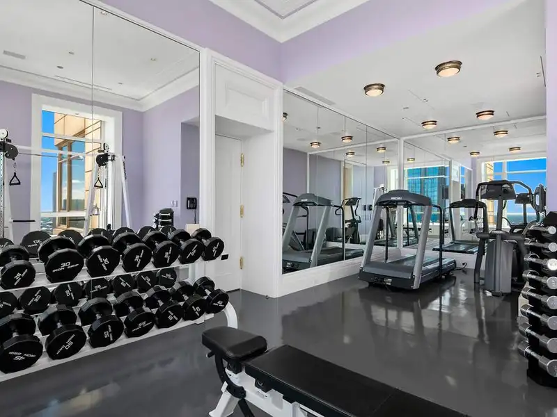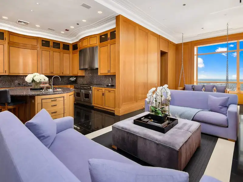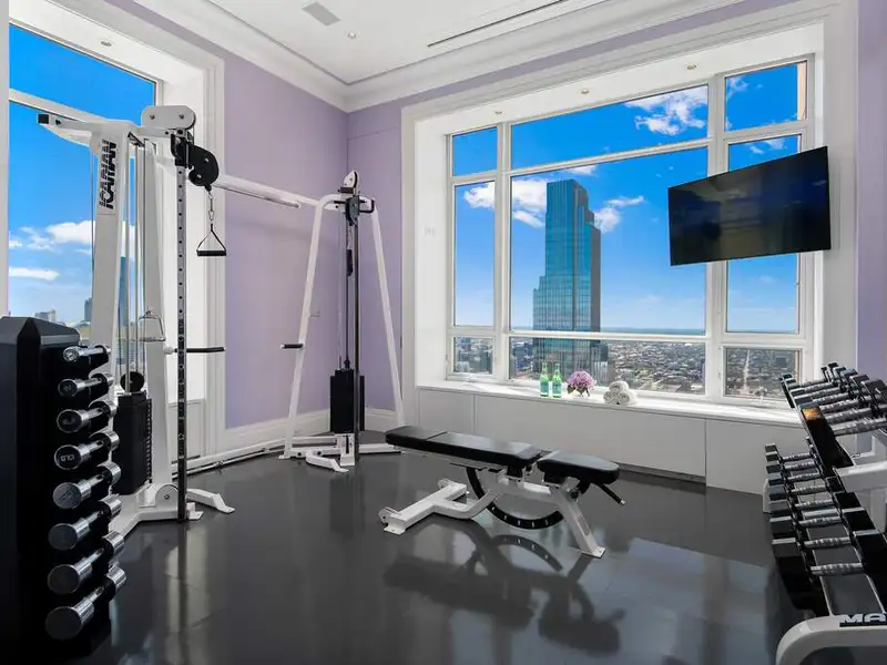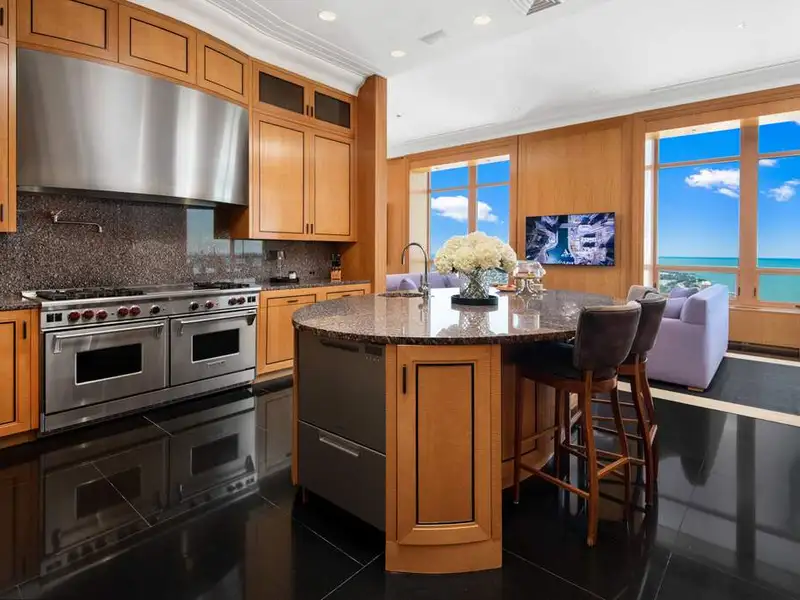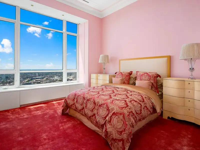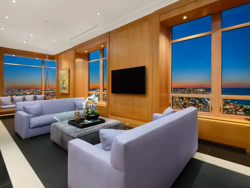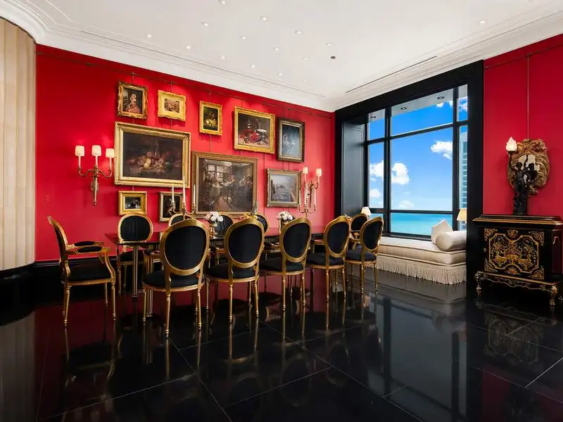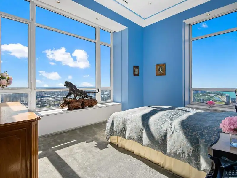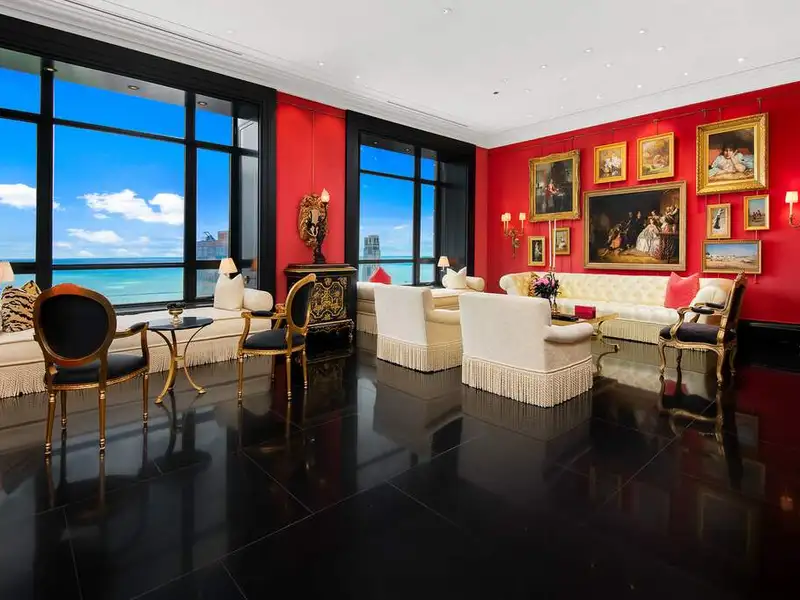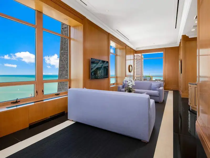 An oasis above the clouds, this one-of-a-kind penthouse comprises the entire 64th floor at the prestigious Park Tower on North Michigan Avenue. Spanning 8,500 SQFT, this 15-room apartment was meticulously crafted by the renowned architectural firm Marvin Herman & Associates and Interior Designer, Mitchell Turnbough. With a 360-degree view of the city, this unique residence is designed to provide an unobstructed panorama of Chicago's skyline. Access this penthouse via one of three elevators and a private elevator foyer, secured with custom designed filigree metal doors and state-of-the-art controls. Herman and Turnbough created a bold sense of exhilaration and drama as you step into the home. The entrance introduces the apartment's 12' ceiling grandeur with an allee of elegant, fluted columns wrapped in cream shagreen. Each space within the home has been purposefully designed to create a sense of majesty without traditional barriers, offering a fluid, uninterrupted walk around the apartment. The living spaces are open and conducive to modern family living, featuring high-level, durable finishes, and bespoke anegre wood paneling. The custom plaster cornice and walls were crafted by hand. Inspired by a vivid Ferragamo scarf, Turnbough enveloped the 2,400 SQFT grand living room and dining room walls in salmon-pink velvet. The space is further enriched with polished black granite floors and lacquered baseboards. The choice of red hues throughout the room enhances the natural light, creating a dynamic interplay of colors that shift with the day's arc, adding a sense of luxury and softness. This ensures the space is equally suited for stately celebrations and intimate gatherings, maintaining a sense of warmth and inclusion regardless of the event size. The dream kitchen features sprawling granite counterspace, top-of-the-line appliances, and is clad in impressive quarter cut figured anegre custom cabinets and wall paneling. A butler's pantry, a unique ovular island, and abundant storage complete the space. The kitchen opens to a great room showcasing spectacular lake and city views with north, east, and west exposures. This gracious space accommodates a breakfast room, a large family room, and a playful 8-person "porch swing," at the west corner of the family room, which floats gracefully from the 12 ft ceilings. The corner primary suite occupies the entire south wing and enjoys abundant sun from southeast exposures and views of the lake and the city down Michigan Avenue. Clad in quarter cut figured English sycamore paneling, no expense was spared in the custom closet & dressing room where you will find copious hanging space, a three-way mirror and a center island. The closet also doubles as a panic room. A luxurious ensuite bathroom, accoutered entirely in a soft golden-green onyx with book matched creamy marbling and gilded gold fittings, enjoys southwest corner views & features heated floors, a steam shower & tub with west-facing views. A sizeable home office paneled in quarter cut figured English sycamore flanks one side of the primary suite while a large exercise room flanks the other side and leads to the west wing of the residence, which is dedicated entirely to four ensuite guest rooms. The owner paid special attention to structural integrity and sound insulation, ensuring a reposeful living environment amidst the bustling city. From an aesthetic perspective, even the door hardware was exclusively designed by Marvin Herman for this penthouse, creating a high level of customization. The home is equipped with automated shades, smart Control 4 integrated surround sound & TV system. This residence offers a rare opportunity to own a significant piece of Chicago's architectural innovation, where every detail has been crafted to ensure unparalleled elegance & comfort. Enjoy Renowned Park Hyatt Hotel amenities at your disposal - 24 hour fitness center, indoor pool, spa, in-room dining, and the acclaimed NoMi restaurant