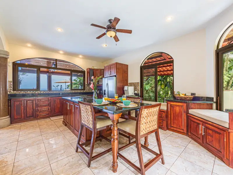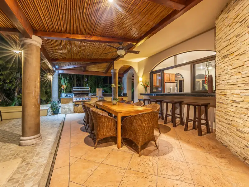 Venture outdoors to indulge in resort-style living: lounge on the massive infinity pool’s sun-kissed recliners, dine al fresco at the teak table, or cook in the outdoor kitchen with a built-in BBQ, sink, and burner. The covered patio creates a perfect retreat for relaxing while enjoying the gentle surf sounds and panoramic vistas. Surrounding the villa are lush gardens, ample outdoor furniture, and a private yard—an idyllic setting for weddings, yoga retreats, or exclusive getaways.