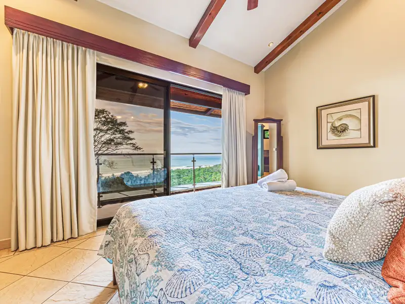 The estate comprises six expansive master suites—each beautifully appointed with air conditioning, private bathrooms, and spectacular ocean vistas. Two suites boast private decks overlooking the infinity pool and the Pacific, while other bedrooms offer flexible arrangements with queen beds, a sofa bed, and additional sleeping options, accommodating groups of friends or family with ease.