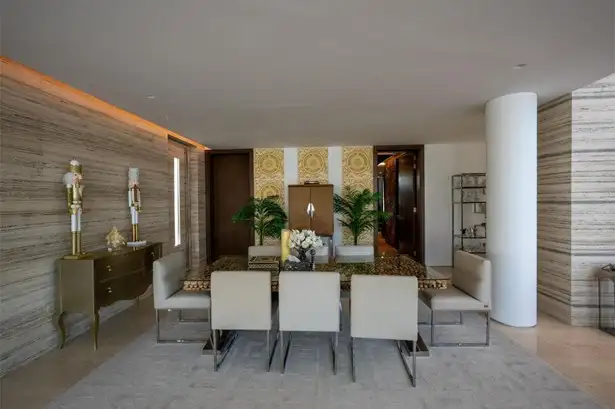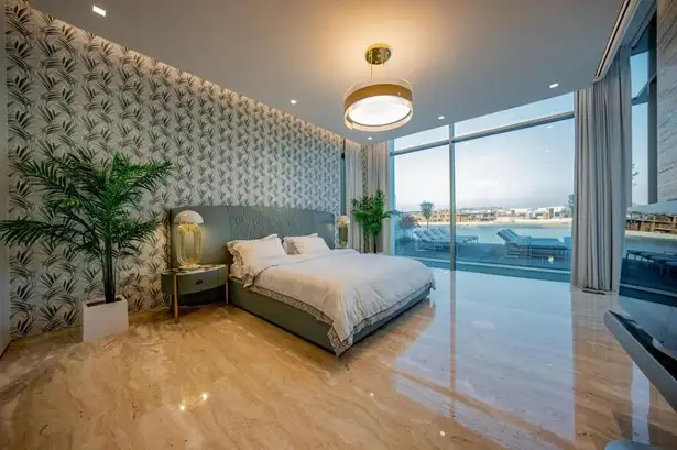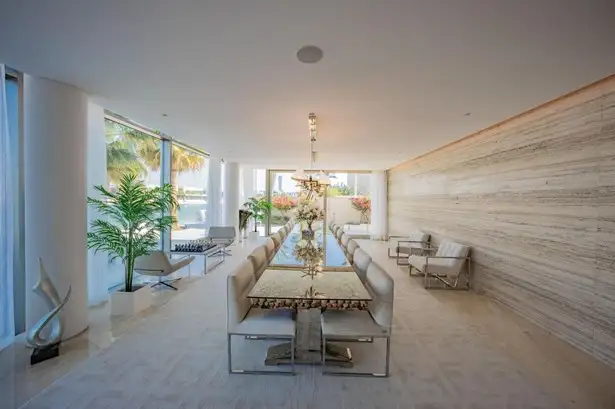 - Flooring: Polished travertine throughout, offering a seamless flow between indoor and outdoor spaces