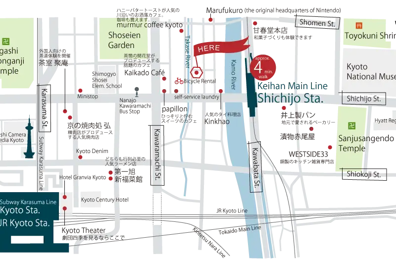 Just a 4-minute walk from Keihan Shichijo Station