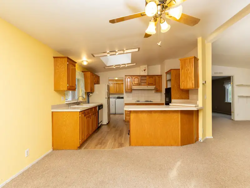 - Open kitchen with oak cabinets