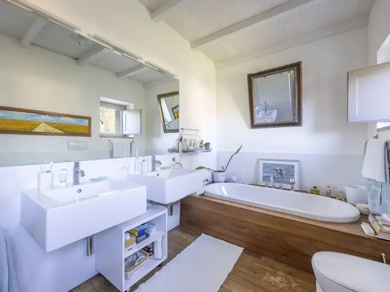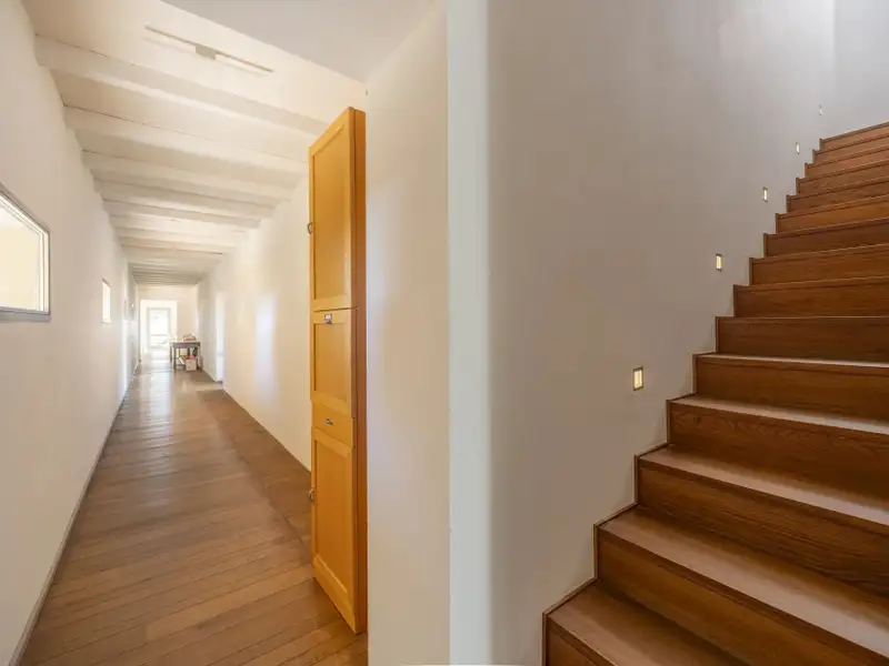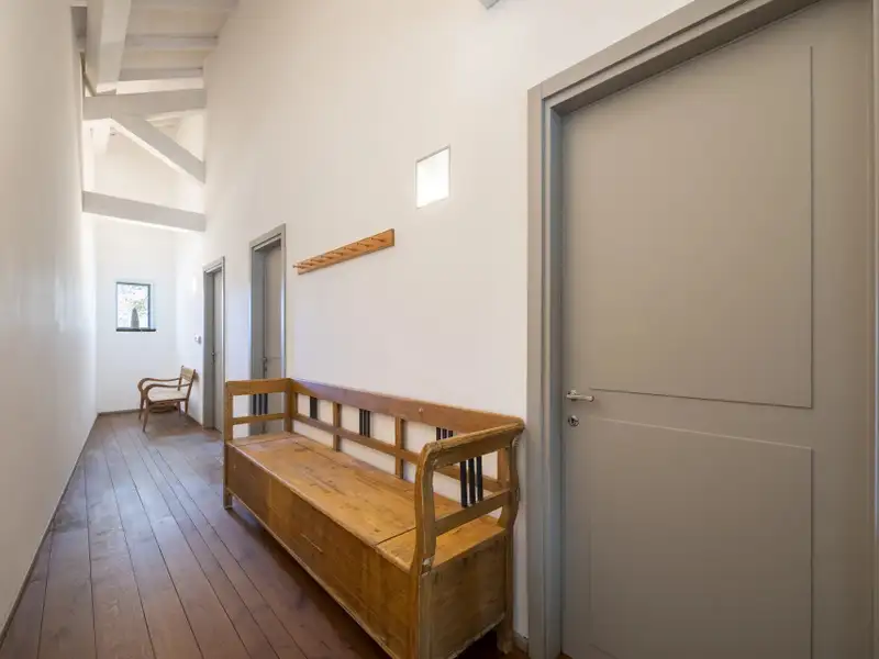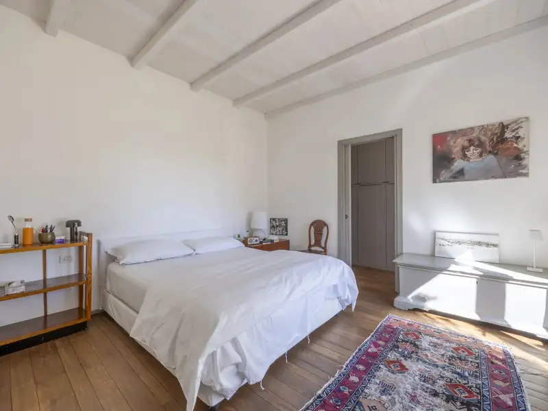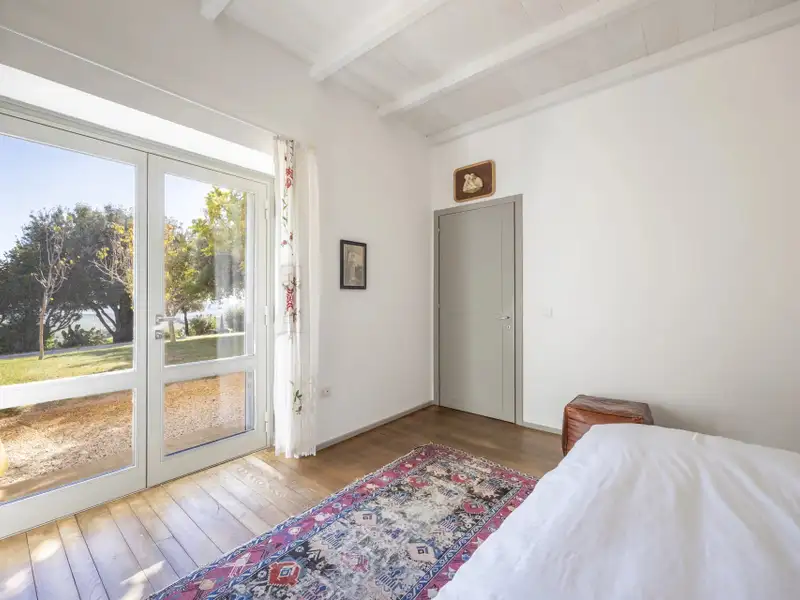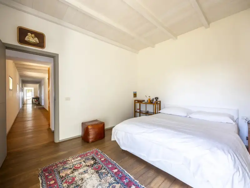 The elegant and functional sleeping area, includes a master suite with walk-in wardrobe and en-suite bathroom, two additional double bedrooms, a second bathroom, and a charming room in the tower ideal as a fourth bedroom or a study with a view. The two wings of the villa are connected by a bright glass hallway that could become a splendid library or art gallery.