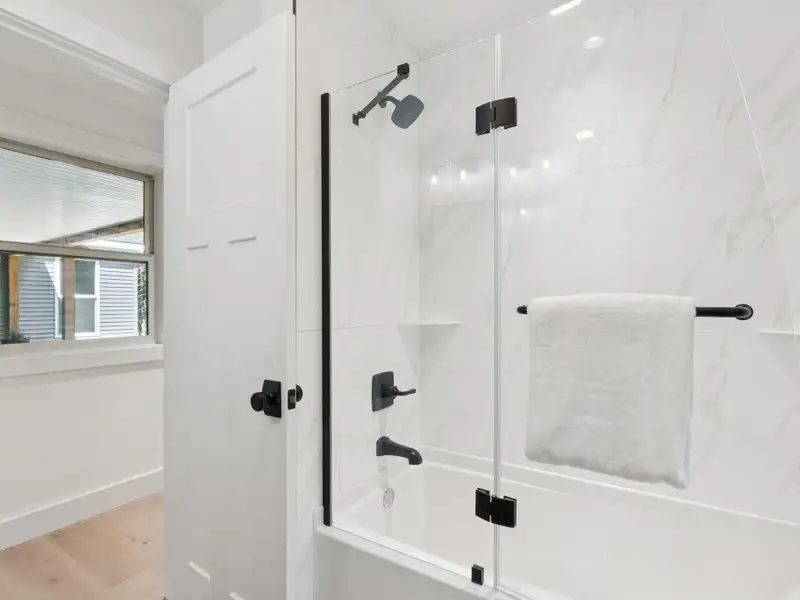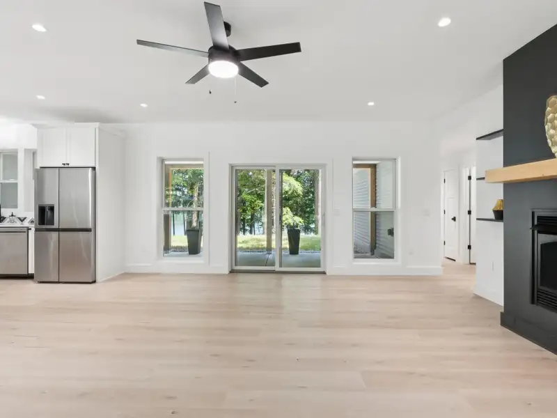 - Large windows with lake views