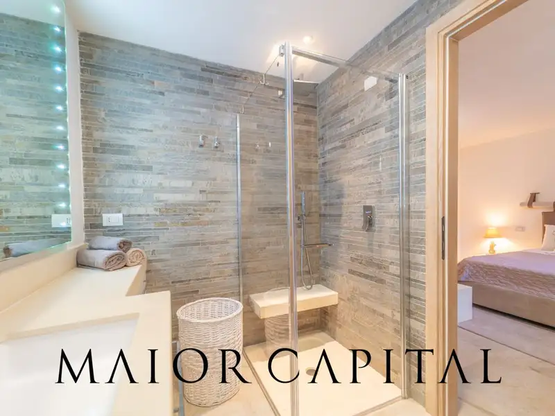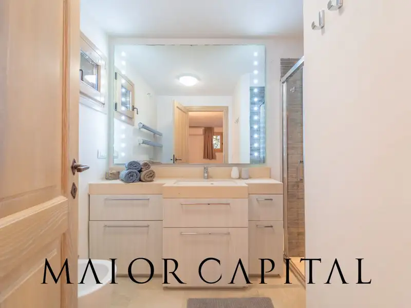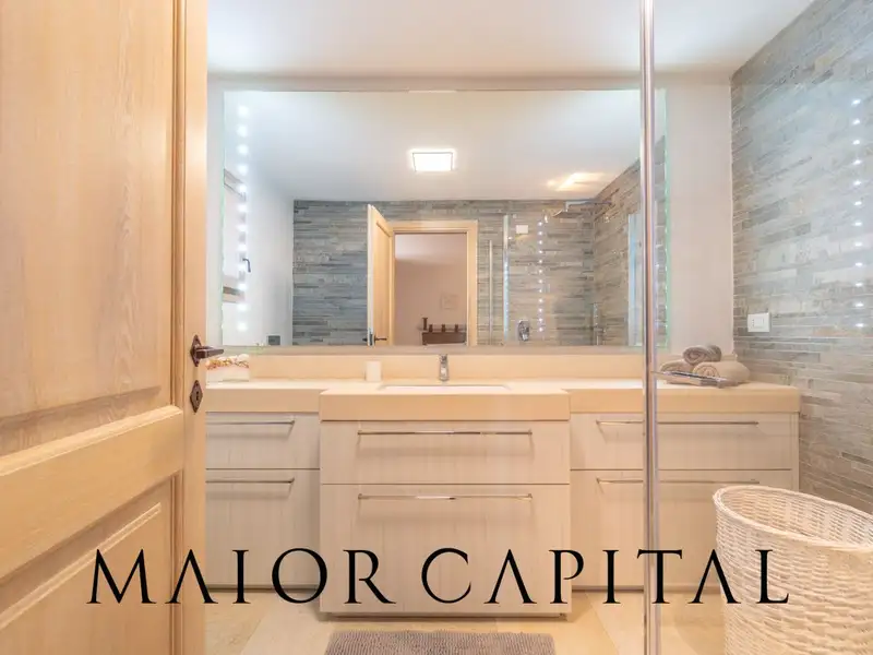 The lower floor, also accessible via an independent entrance, is designed to offer maximum versatility and hospitality. A second spacious living area can be transformed into a private cinema room, ideal for family evenings or entertaining guests in comfort. The sleeping area consists of four bedrooms, each with its own private bathroom, offering high-level accommodation in a private and quiet setting.