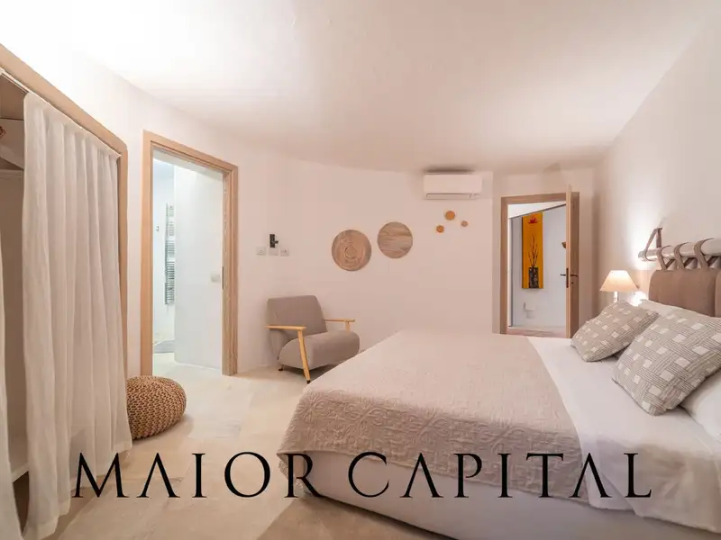 This luxury property stands out for its contemporary Mediterranean style, harmoniously blending traditional elements with modern lines softened by elegant architectural curves. Recently renovated with high-quality finishes, it is spread over two levels. On the main floor, a bright living area with exposed wooden beams and large windows welcomes guests into a sophisticated and welcoming environment. The living area opens to the outside onto a furnished porch, ideal for relaxing or dining at sunset with the scent of the sea.