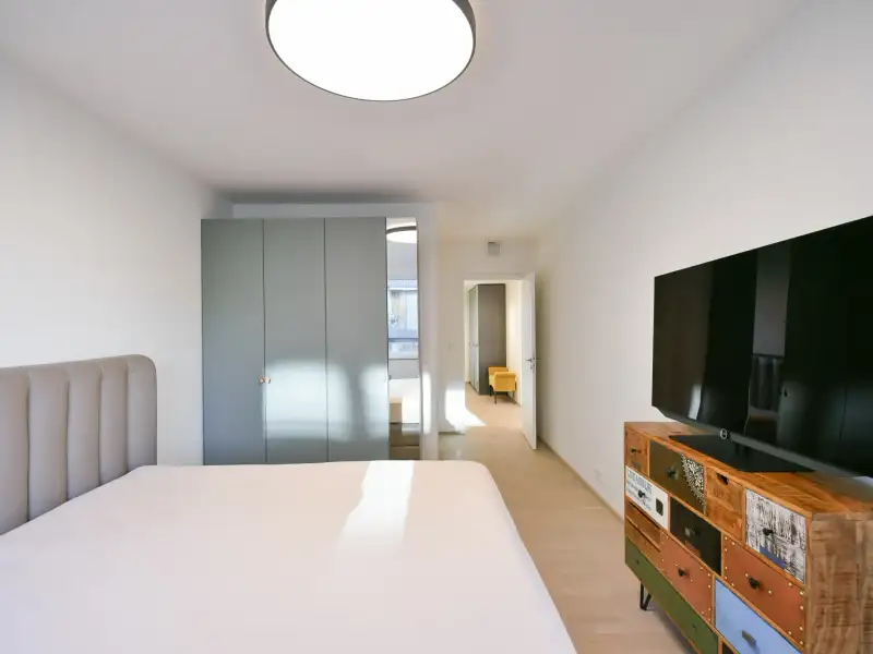 Upon entering the apartment, you will be captivated by the pleasantly designed space and high-quality materials. The property consists of a living room with premium kitchen incl. De Dietrich appliances from the highest range. From the living area, there is access to a generous balcony with views of the greenery and surrounding buildings. The apartment also features a master bedroom with an en-suite bathroom and toilet, 2 additional rooms, a bathroom with a bathtub, a separate toilet, a spacious pantry, and an entrance hall. The sale includes a cellar and 3 spacious garage parking spots.