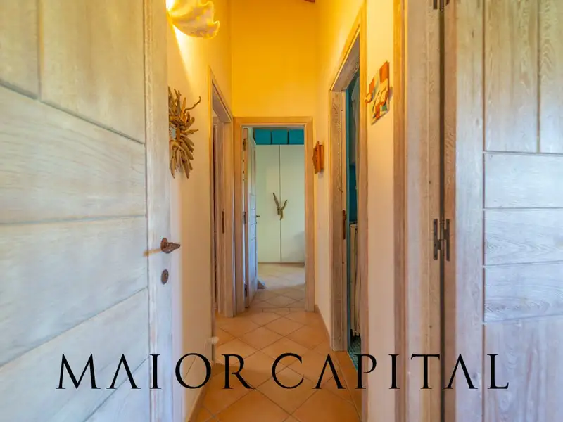At the entrance, a spacious covered veranda invites you to relax outdoors, providing the ideal place to enjoy sunny days and summer evenings with a unique view of the garden and the sea. Inside, the living area features a spacious living room with a fully equipped kitchen, bright and airy, perfect for entertaining guests or relaxing with the family.