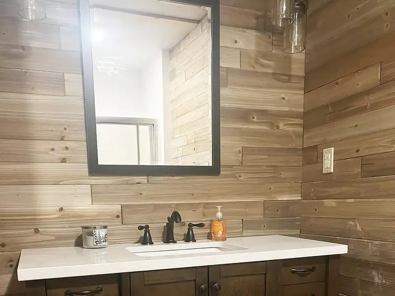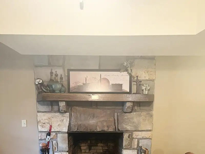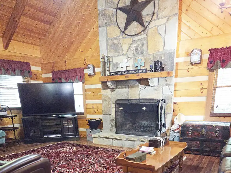 - Floor-to-ceiling stone fireplace
