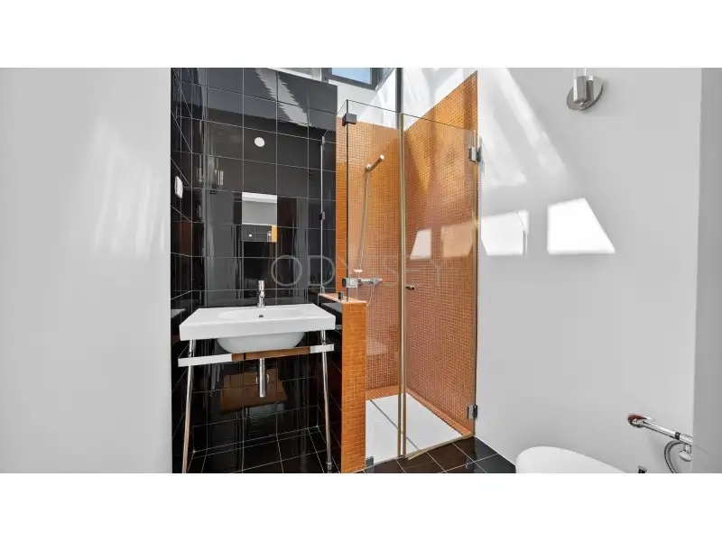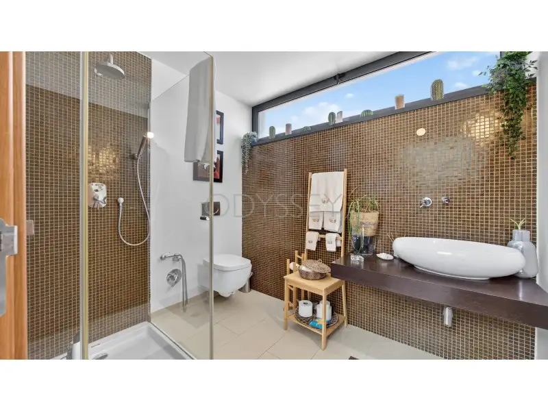 Uma das casas de banho inclui uma claraboia, banhando o interior com luz natural e adicionando uma atmosfera serena. Em toda a casa, azulejos de pedra real complementam o piso de madeira para criar uma estética moderna e aconchegante.