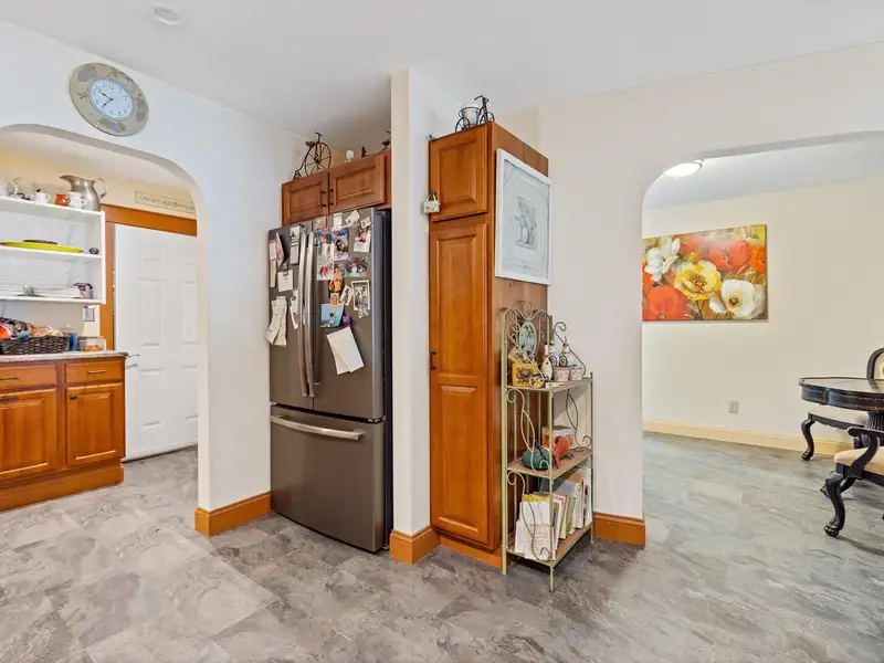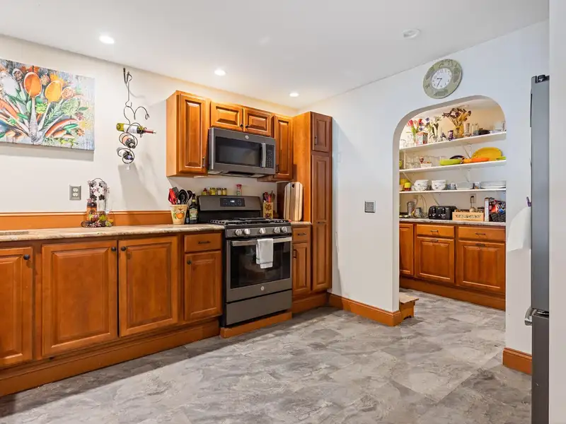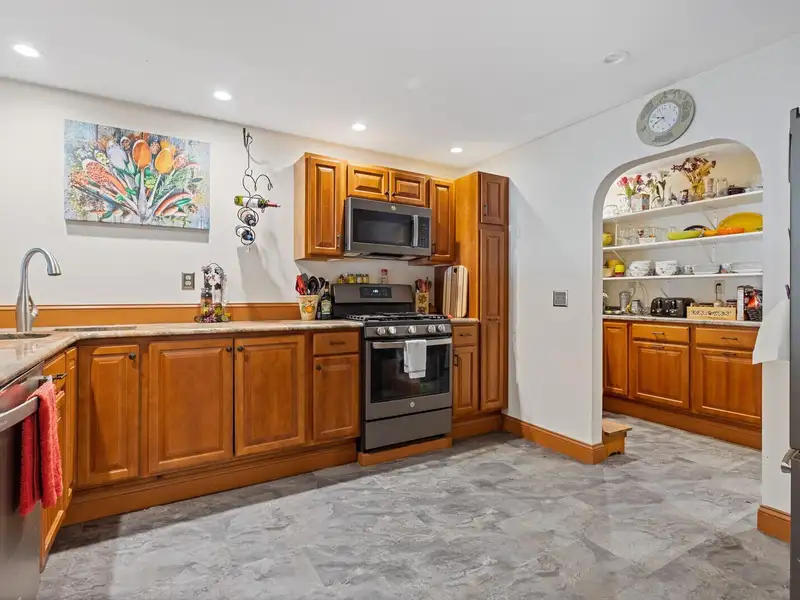 - Kitchen with granite countertops and pantry
