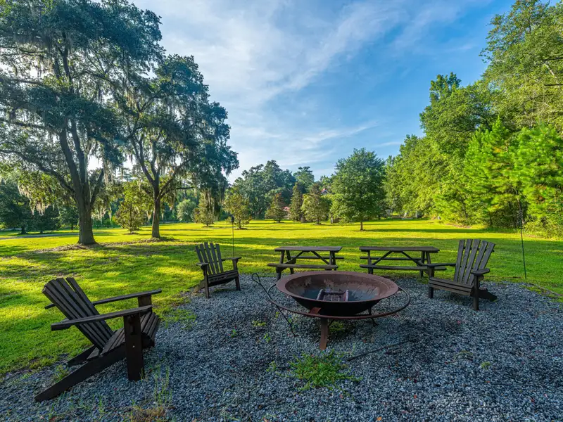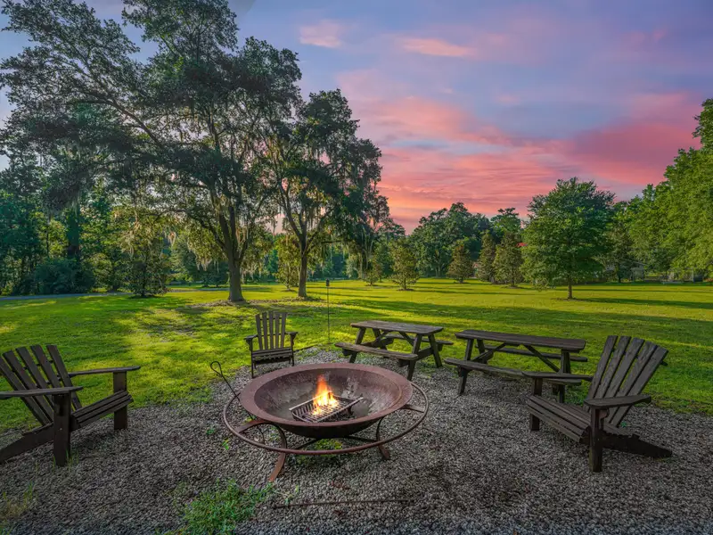 The roof on the guest house was recently replaced in December 2024, and the roof on the main house was replaced in approximately 2020. Both roofs were installed by Professional Roofing out of Bluffton, and are under warranty. There's a graveled floor firepit area complete with picnic tables and Adirondack Chairs. A fenced garden area with raised boxes is located near the