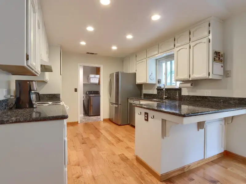 - Kitchen with painted cabinets and granite counters