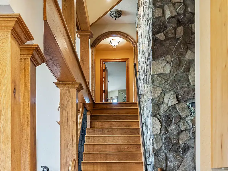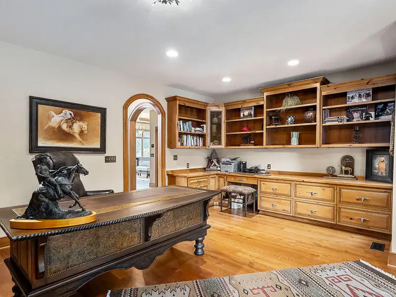 Additional highlights include a home office/library with built-ins, a stone accent wall with a cedar-shingled overhang, 2 generous upstairs guest bedrooms with private vanities, a walk-in cedar closet, a lovely main floor powder rm, a generous back-hall with coat/utility closets, laundry, and access to the 3-bay garage (nearly 12 ft. ceilings), and climate-controlled basement. A covered back porch is a welcoming place to take off your boots when coming inside from riding or attending to your dogs & horses.