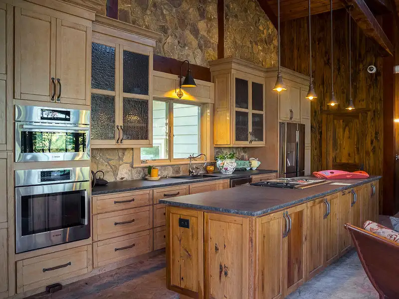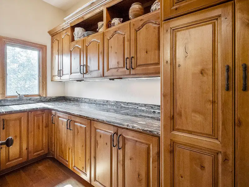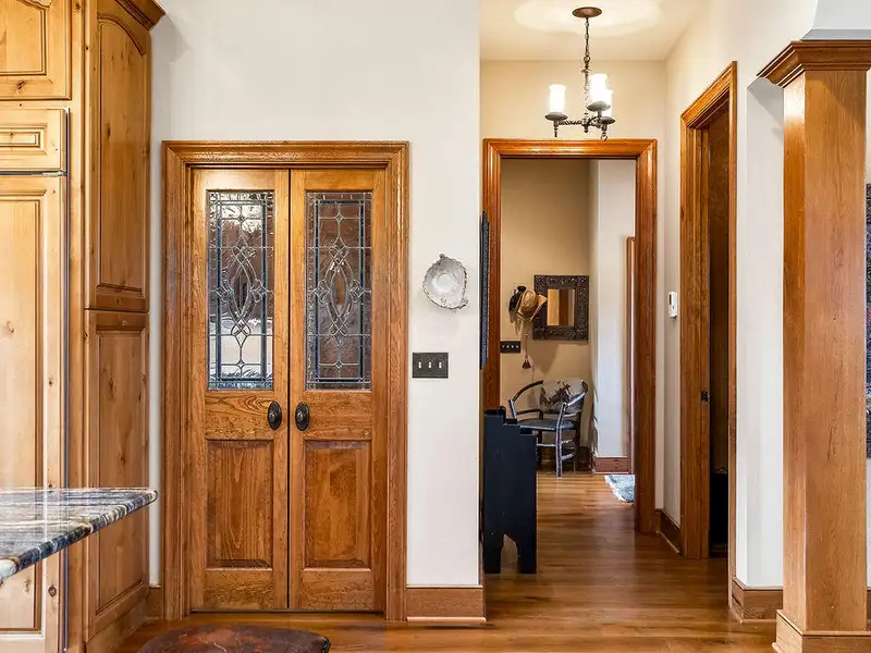 The showstopper kitchen is outfitted with handsome, knotty alder cabinetry, gorgeous granite counters and elite appliances including built-in SubZero refrigerator, Asko dishwasher, Wolf 6-burner gas range and Gaggenau steam and convection ovens. Stained glass doors open to a walk-in pantry, ideal for a coffee/espresso bar, in addition to storage.