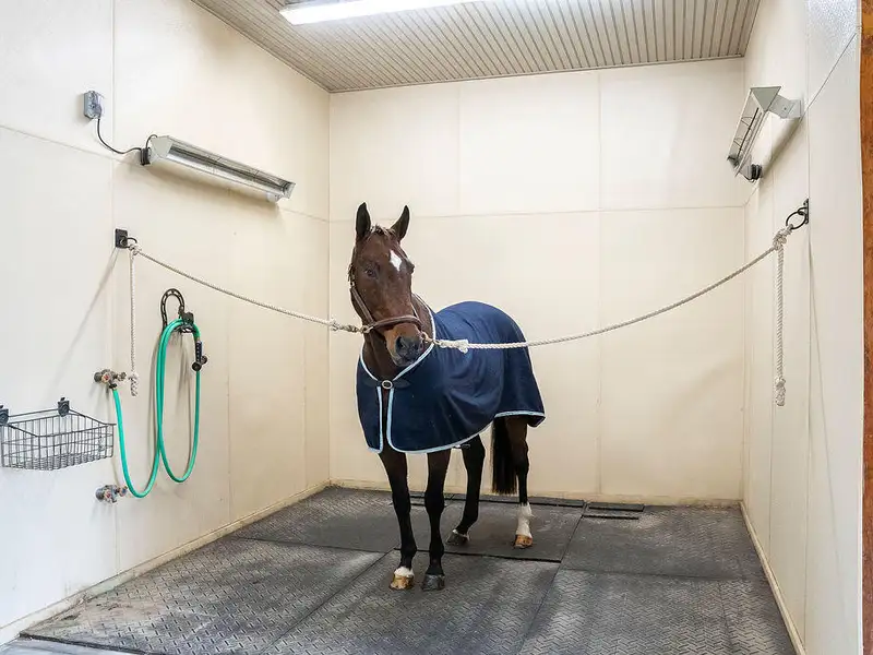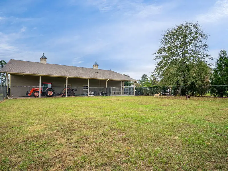 The 3500 sq.ft. climate-controlled barn has 4 stalls with Nelson automated-waterers & fans; wash-stall with heat lamps; storage and tack room, equipment/carriage storage area & laundry room with professional dog washing station. When you are away from home, your dogs will be comfortable in the kennel wing with kitchenette, half bath and 5 runs opening to a large, fenced yard. Your horses will love the turnout - 2 pastures and 2 paddocks - with 3 matted run-ins equipped with automatic waterers, fans & lights.