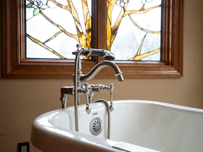 The multi-room primary retreat offers a spacious bedroom with a gas fireplace and Schoenbach crystal chandelier, dual room-size custom closets, and luxurious bath quarters featuring a sculptural jetted clawfoot tub, steam shower, heated floors, towel warmers, and stunning Savannah River Art-stained glass windows for a harmonious environ.